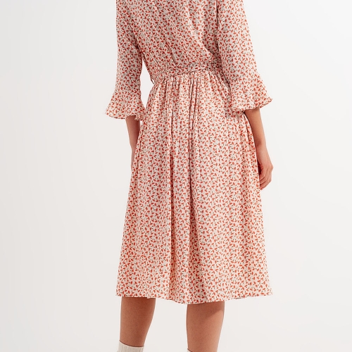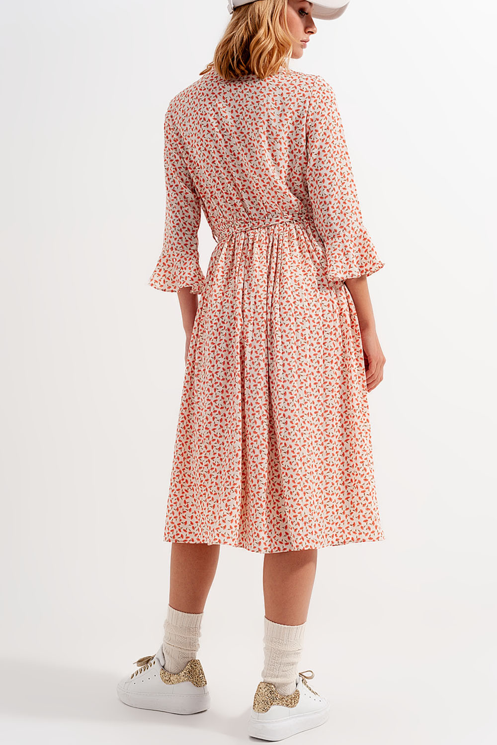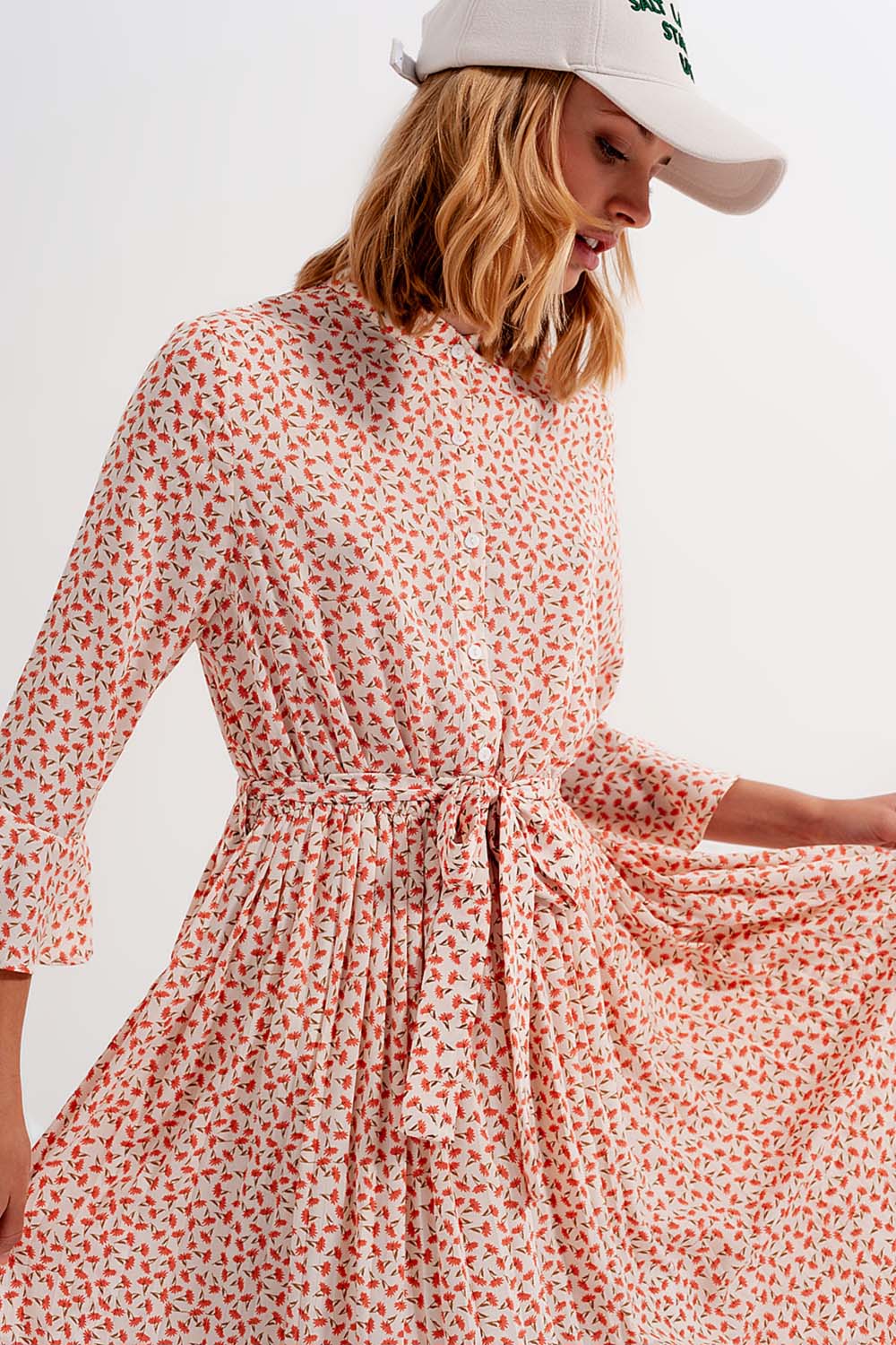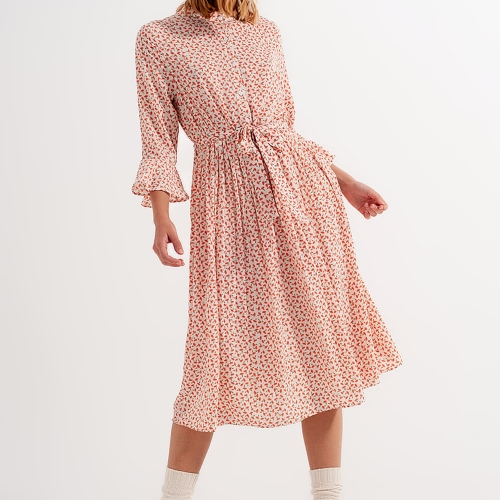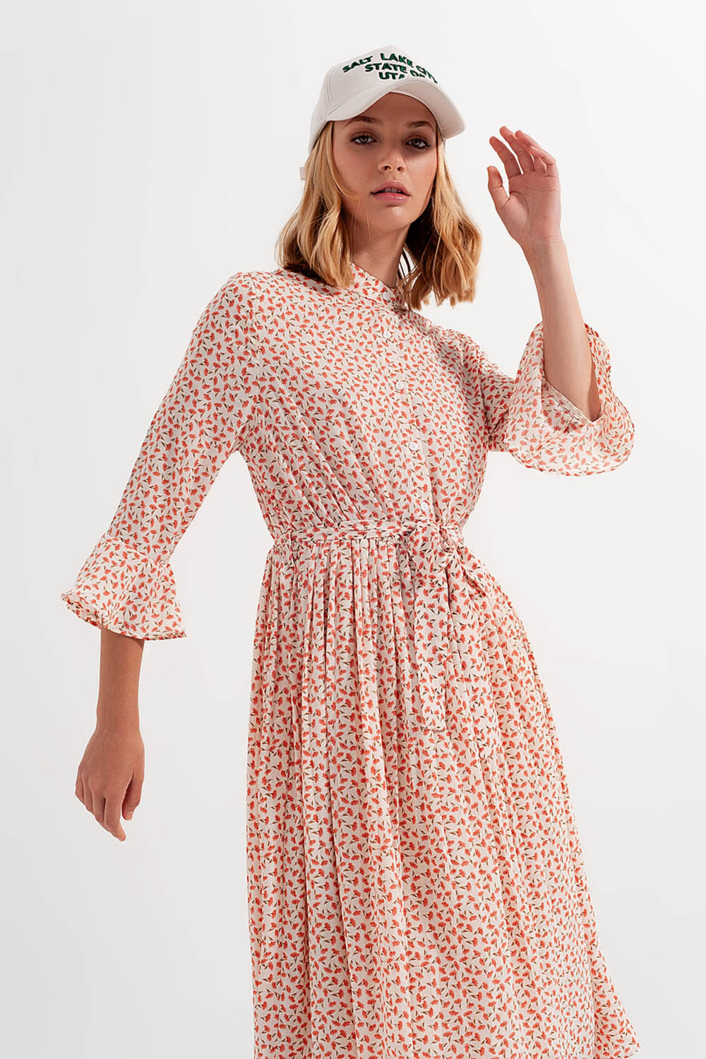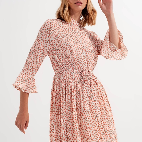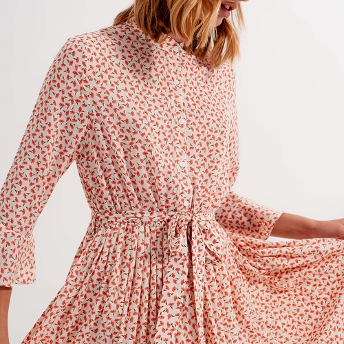 ress with pleated skirt and buttons on the top fluted sleeves elastic waist and tied belt in a lightweight woven fabric