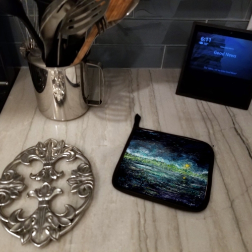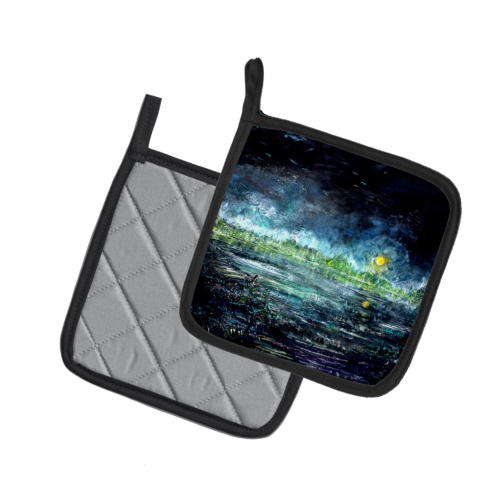 A Pair of Pot Holders to match your kitchen decor. Made in the USA these are thick and functional. Full color artwork decorates the front polyester fabric of the hot pad and accented by a black trim. Use these at as a trivet for your Thanksgiving or Christmas tablescape. Filled with insulated fabric and quilted for durability. These colorful pot holders will make a great gift for your favorite home cook or executive chef. Each pot holder measures approximately 7 1/2 inches by 7 1/2 inches. A hanging tab is included.