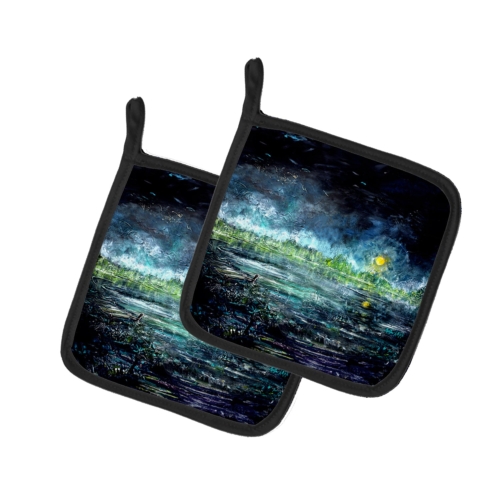 A Pair of Pot Holders to match your kitchen decor. Made in the USA these are thick and functional. Full color artwork decorates the front polyester fabric of the hot pad and accented by a black trim. Use these at as a trivet for your Thanksgiving or Christmas tablescape. Filled with insulated fabric and quilted for durability. These colorful pot holders will make a great gift for your favorite home cook or executive chef. Each pot holder measures approximately 7 1/2 inches by 7 1/2 inches. A hanging tab is included.