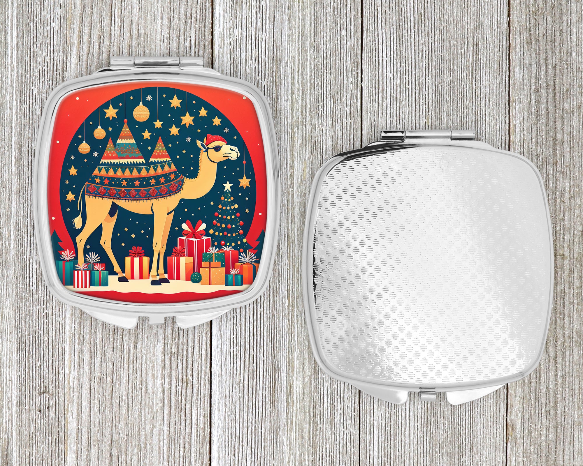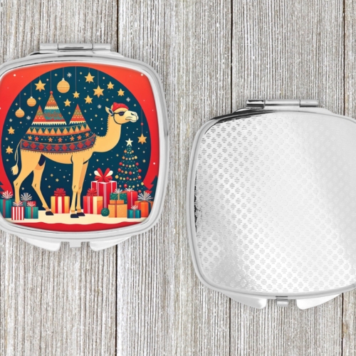 Compact Mirror featuring breed specific Camel artwork. Celebrate Christmas with this Christmas Compact Mirror. Introducing our Square Compact Mirror, a blend of elegance, functionality, and compactness, perfect for on-the-go touch-ups. This Silvertone metal mirror, with dimensions of 2.75 inches x 3 inches x .3 inches, fits effortlessly into your purse, handbag, or pocket, ensuring that you can check your appearance anytime, anywhere. Our compact mirror stands out with its eye-catching artwork on the front, adding a dash of style to this practical accessory. It is more than just a mirror; it’s a statement piece that reflects your personality and aesthetic. When opened, this compact reveals two mirrors inside, doubling your perspective for precise touch-ups. The Silvertone metal construction ensures durability while maintaining a lightweight feel, making it an ideal everyday carry item. Whether you’re rushing to a meeting, prepping for a dinner date, or just need a quick check on your look, our Square Compact Mirror is your reliable companion. Experience the perfect blend of style and practicality with this must-have accessory.