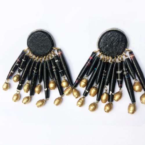 Handmade from waste newspaper dyed with pigment and black and mini gold paper beads this design is elegant and easy to wear, as well as being sustainable with a positive social impact. Made in eSwatini, Southern Africa by a group of artisans.