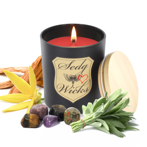 Sage, Sandalwood & Ylang Ylang, Crystal empowered candle for important moments of centring, self love and showing that special someone you love, you care.