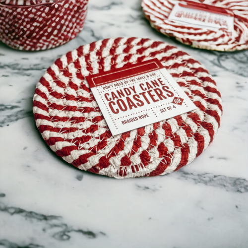 Add spice to your table with these coasters that are as festive as a fruitcake at a Summer or Christmas dinner! With a candy cane stripe pattern and braided flair, they’re like the Santa hats of your coffee table, protecting it with style. Say goodbye to those pesky water rings and hello to coaster perfection!