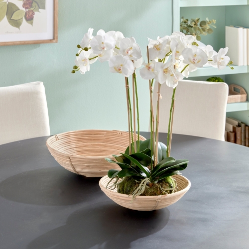 This oversized low bowl cane rattan set of two are stacked, not woven creating a more substantial basket. With a light and refined look, cane rattan is at home in the modern to transitional space. – Natural