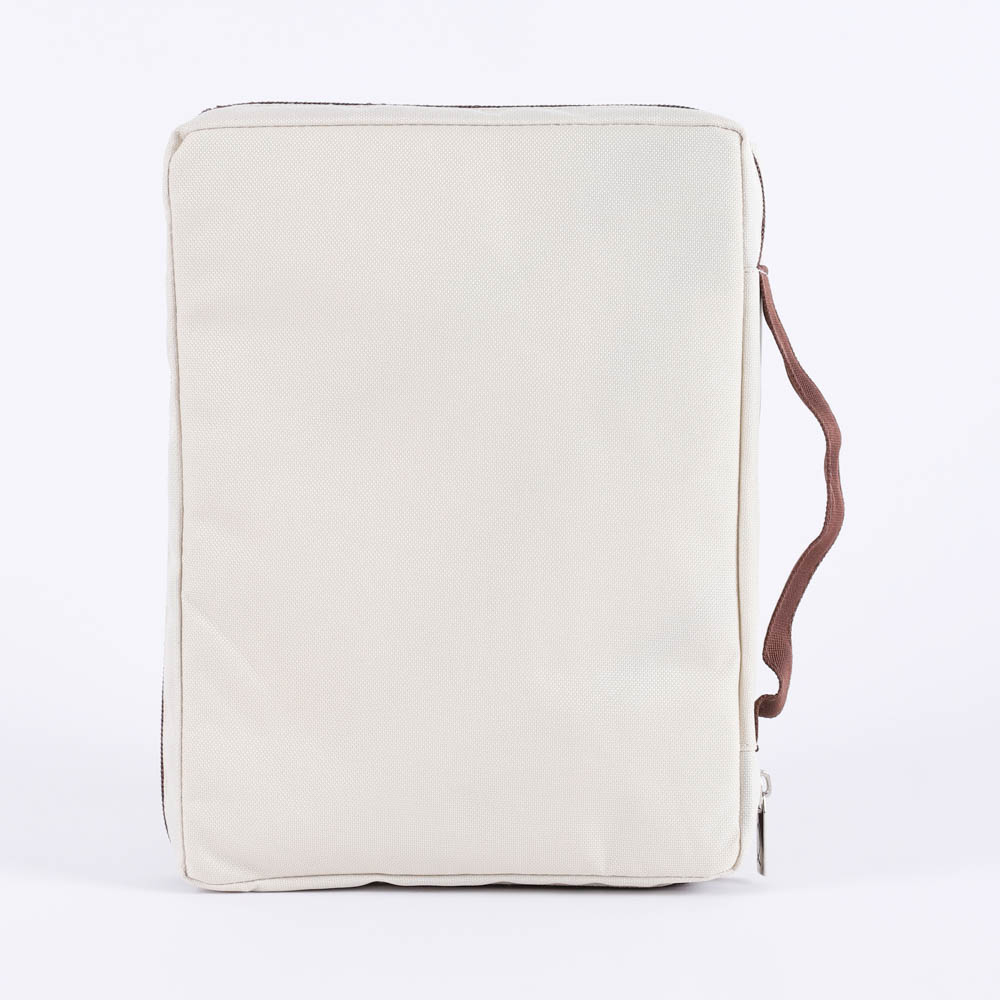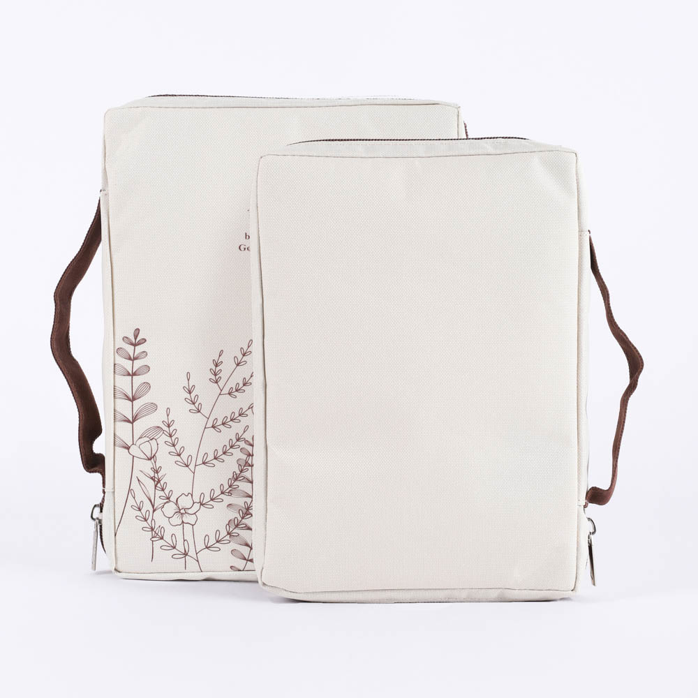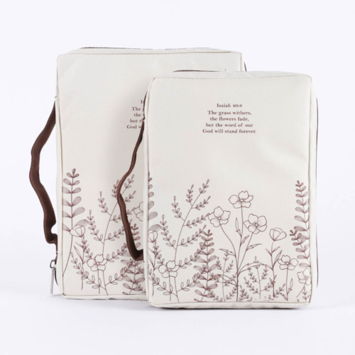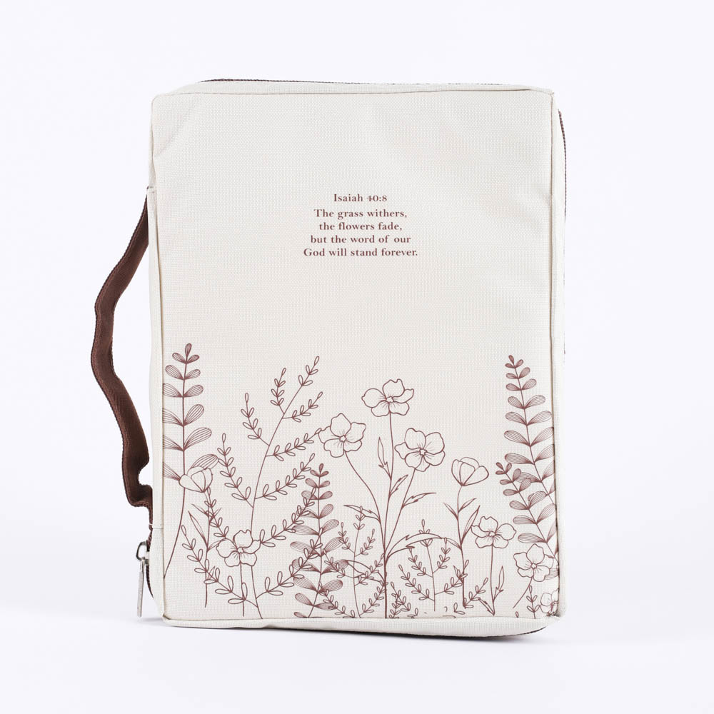 Embodying both style and functionality, the exterior is a natural creamy canvas color, adorned with an elegant floral pattern and Isaiah 40:8 in a natural shade of dark brown. It becomes a practical and convenient choice with the addition of a sturdy canvas carry handle and a secure zipper closure, both matching the natural dark brown design color.
