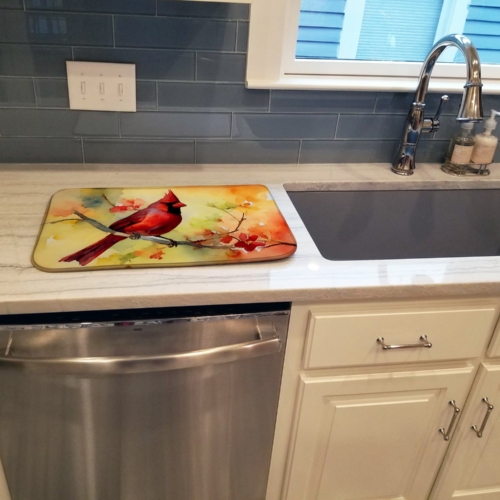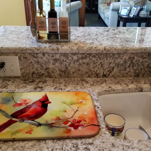 Dish Drying Mat featuring breed specific Cardinal artwork. Say goodbye to messy countertops and soggy dish towels with our innovative dish drying mat. Our high-quality dish drying pad is designed to keep your countertops dry while offering a stylish and efficient solution. Whether you’re air drying dishes, glasses, stemware, silverware, pots, pans, bottles, or even fruits and vegetables, our dish mat is the perfect choice. The 14 inches x 22 inches size fits most counters and dish drying racks, and the non-slip design ensures stability. Made with water-absorbent polyester and a polyurethane foam insert, our dish drying mat is not only functional but also durable. It’s machine washable and printed in the USA for long-lasting use. The beautiful artwork adds flair to your kitchen decor, making it a perfect housewarming gift or present for any occasion. Upgrade your kitchen experience with our absorbent and versatile dish drying mat.