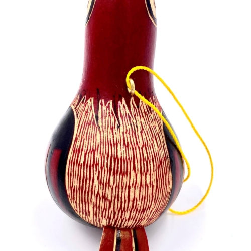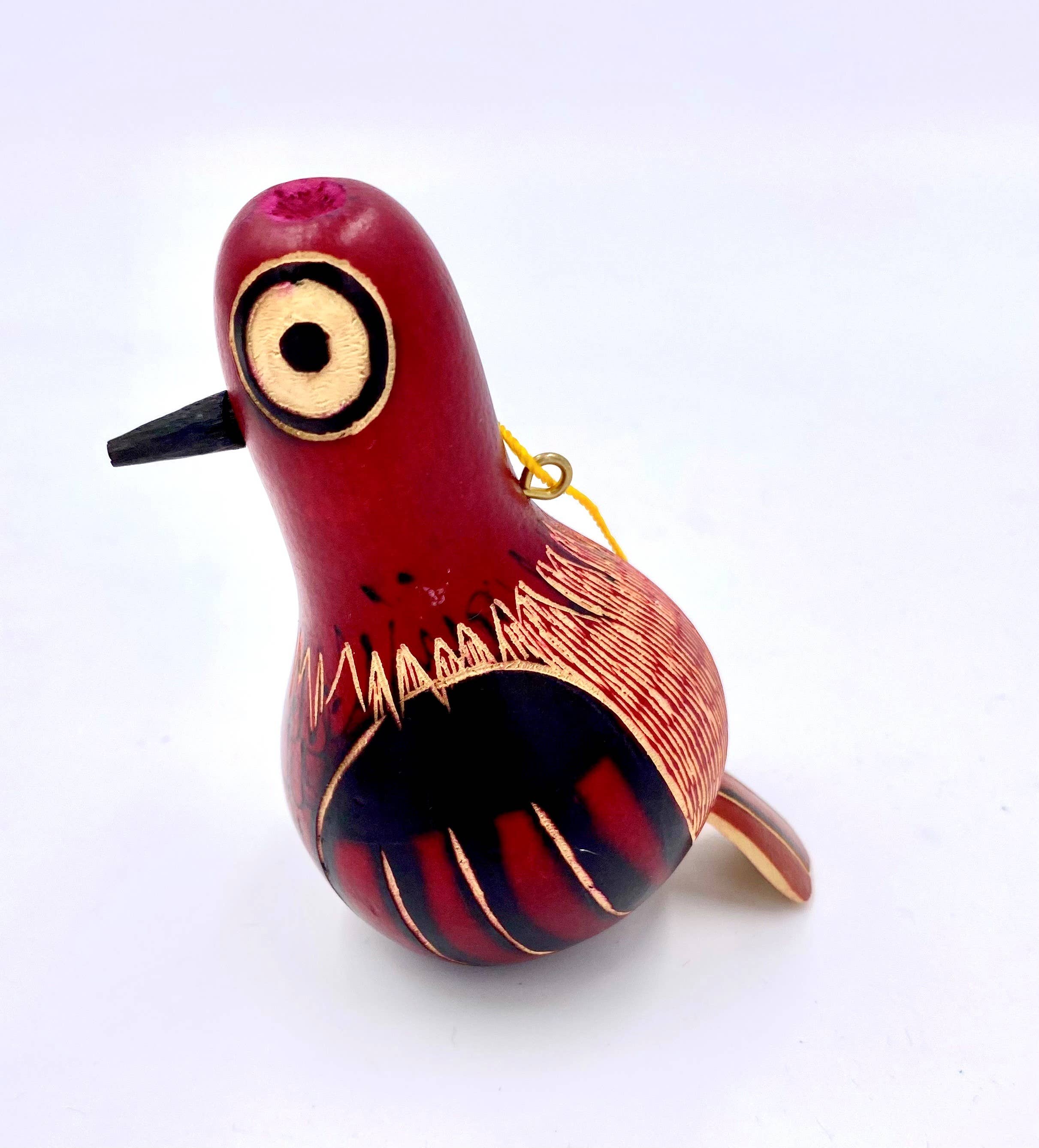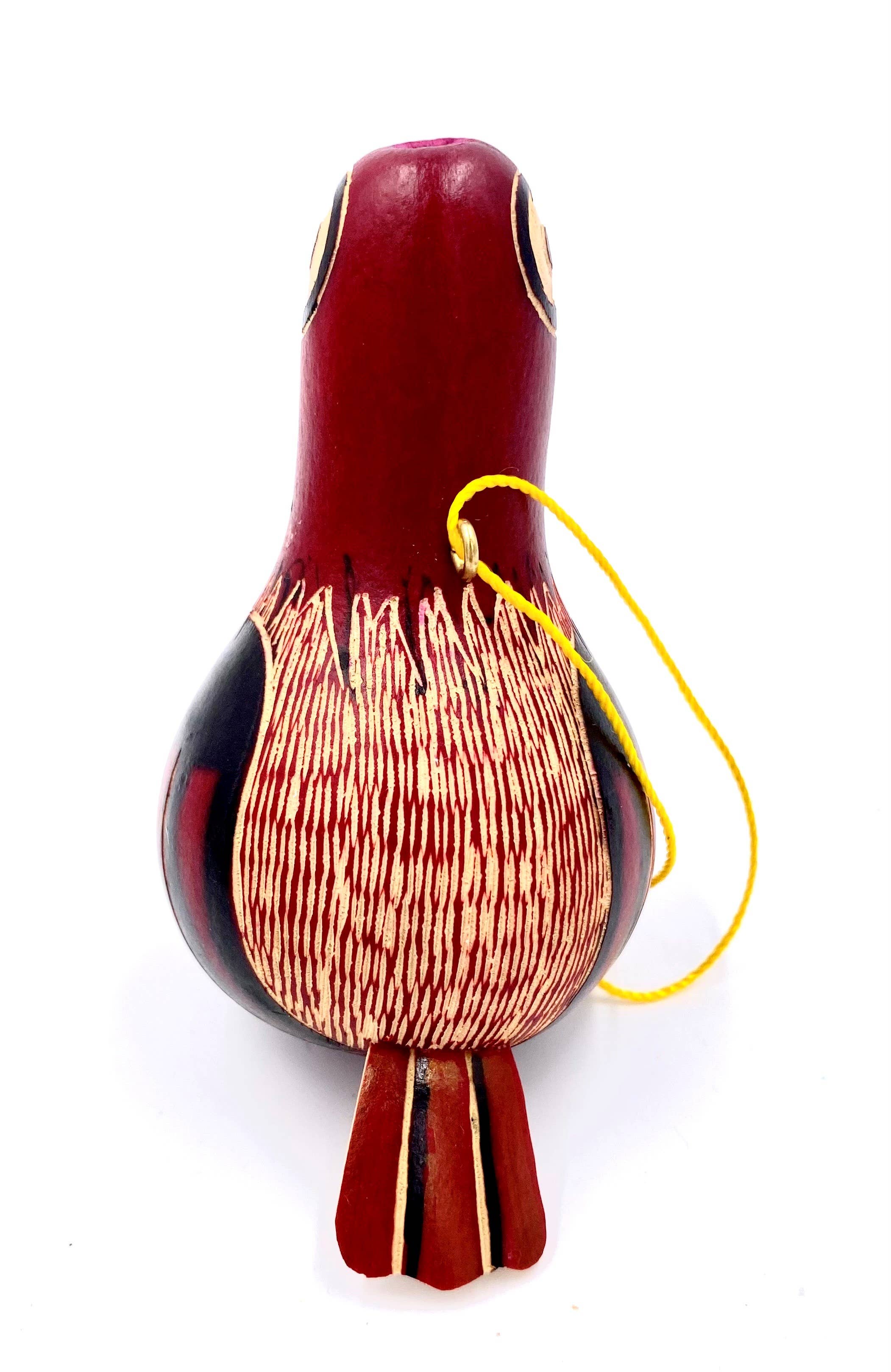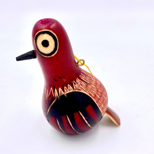 This simple but elegant little bird made in gourd shows different techniques from a family of Peruvian artisans. This high style bird was painted in one color, drew borders, eyes, and feathers with a burning technique, carved in detail neck and back, and its beak was made by wood.Every gourd is handmade based on ancestral Andean culture, carried from generation to generation. Perfect to add color to your Christmas treeAll our gourds are biodegradable, when you consider that it’s time for its second life, please bury in the ground (including the wood Shaquira), it will help as fertilizer and nutrients for the soil.Product Condition: NewWeight (lbs.): 0.13Width (in.): 3Height (in.): 4