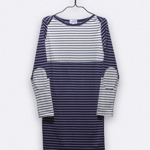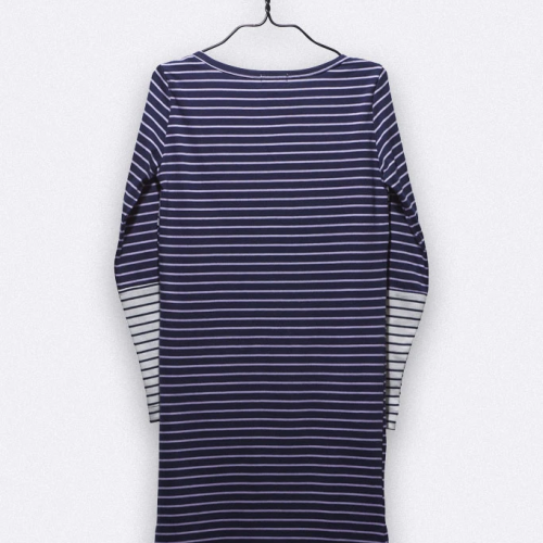 The Carla dress is a basic longsleeved t-shirt dress with a sophisticated fabric combination. Made of navy/lilac and off white/navy striped organic cotton it is the perfect dress for any occasion. The dress is available for kids as well as for women.