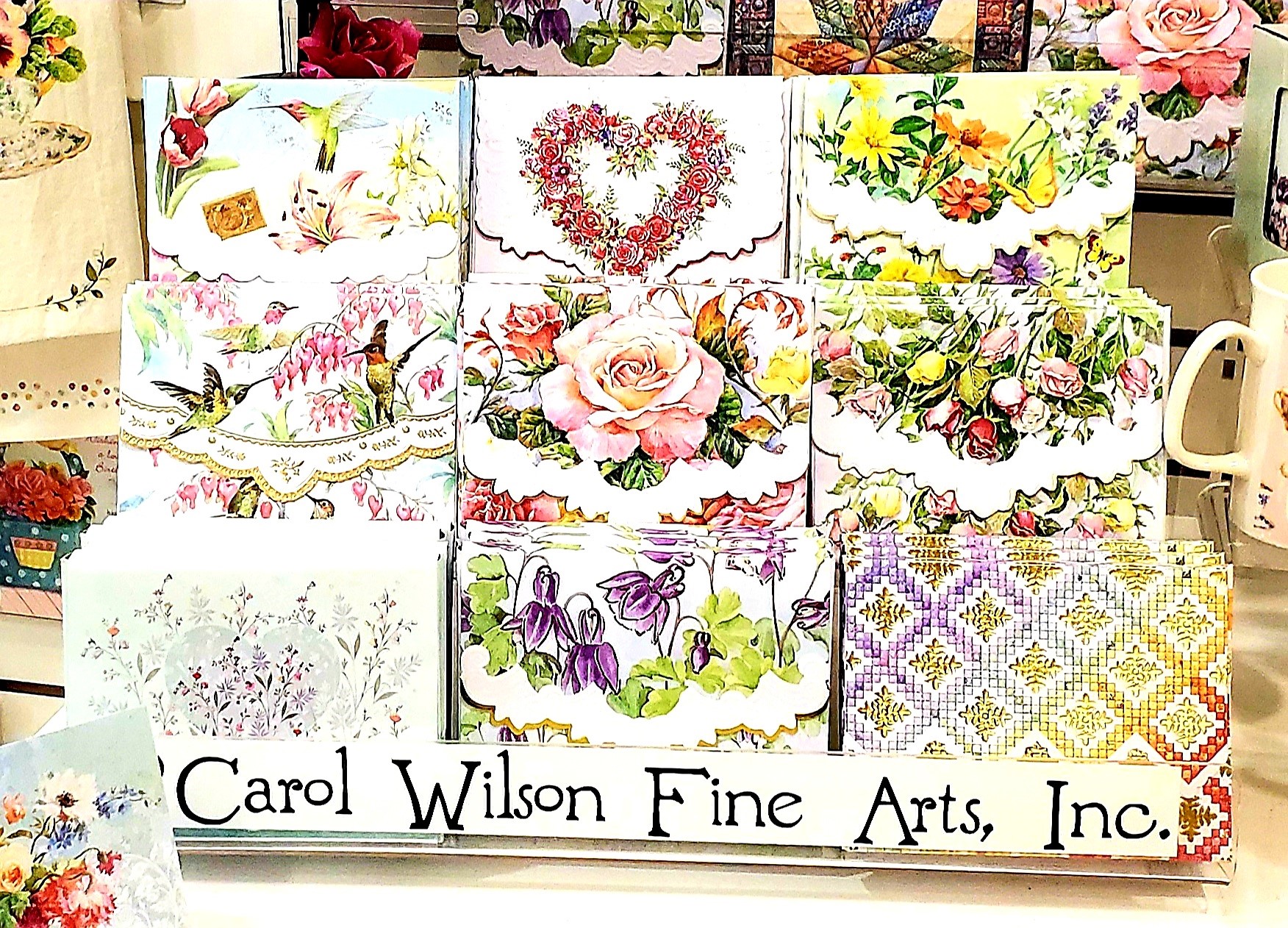 Famous Carol Wilson Fine Arts embossed, die-cut portfolio note cards pre-pack. 6 boxes of 9 designs. 54 boxes total. All boxes are embossed, die-cut and made of sturdy card stock. Inside each box are 10 embossed and die cut note cards and 10 embossed and die-cut envelopes. Each box retails for $9.99. Clear acrylic display included.