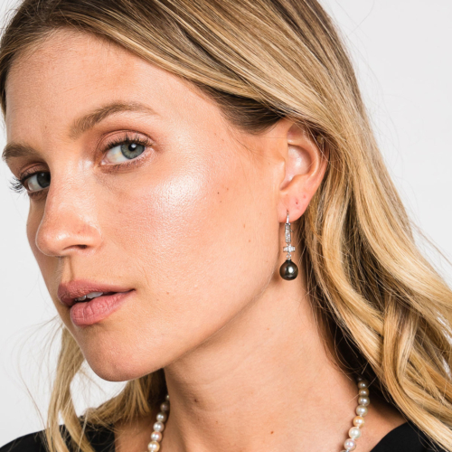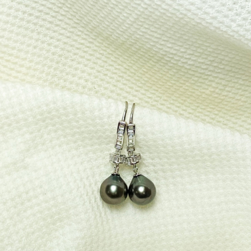 These gorgeous tahitian pearl drop earrings features a exquisite Tahitian baroque pearl dangling from an array of white stones giving visual way to the royalty of all pearls. product detailsProduct Type: EarringsProduct Measurements: 1.77″X 0.77″Pearl Type: Tahitian PearlPearl Size: 9.6mm Pearl Color: Black/GreenMetal Type: S925 Sterling SilverStone Type: Zircon Tahitian Cultured PearlsTahitian cultured pearl or black pearls, don’t just come in the colors of grey, black and brown, in fact, they will almost certainly display blue to green, copper, purple, yellowish green or pink overtones. In the pearl industry, the term “pistachio”, “aubergine”, or “peacock” is often used to vividly describe the Tahitian pearl color. Pearl Care & Additional Information