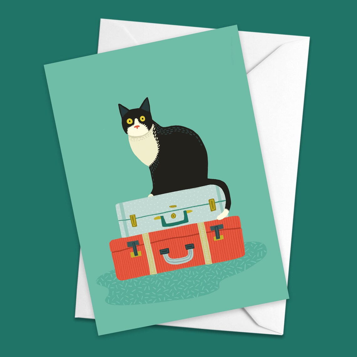 A beautiful illustrated card featuring a cat sitting on a suitcase. It is perfect for anyone leaving, or going off on their travels.