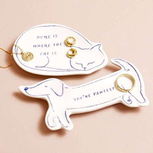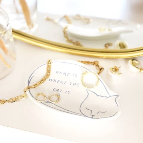 Made of ceramic in a neutral white shade, this tray is rounded in shape and is complete with an outline of a snoozing cat in blue. The centre of the trinket dish features the quote ‘home is where the cat is’, making it ideal for a friend whose cat is their entire life. Pop this sleeping feline on a dresser or by your bedside and keep your jewellery safe and sound!Dimensionswidth 7cm x length 10.5cm x depth 1.5cmMade fromceramic