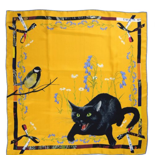 This bandana size square scarf has a beautiful and quirky cat and bird print. With its soft feel, this scarf will brighten up any outfit. A must have for every cat-lover!