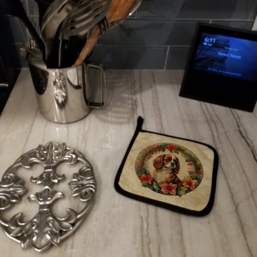 Pair of Pot Holders featuring breed specific Cavalier Spaniel artwork. Celebrate Christmas with this Christmas Pair of Pot Holders. A Pair of Pot Holders to match your kitchen decor. Made in the USA these are thick and functional. Full color artwork decorates the front polyester fabric of the hot pad and accented by a black trim. Use these at as a trivet for your Thanksgiving or Christmas tablescape. Filled with insulated fabric and quilted for durability. These colorful pot holders will make a great gift for your favorite home cook or executive chef. Each pot holder measures approximately 7 1/2 inches by 7 1/2 inches. A hanging tab is included.