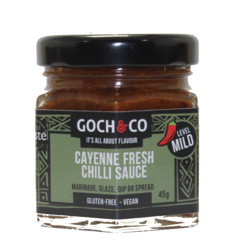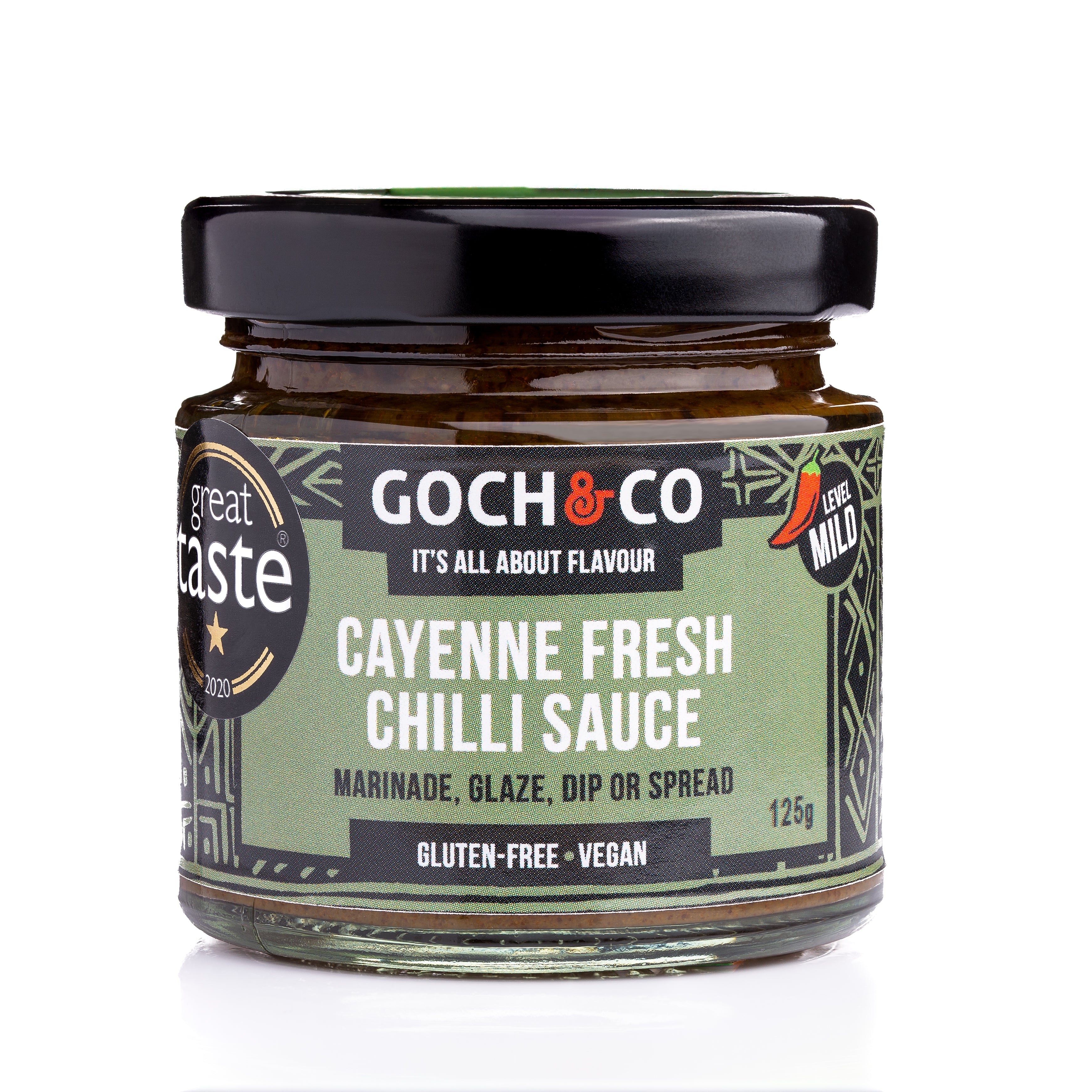 Cayenne Fresh Chilli Sauce A multiple awards winning sauce, and concentrated blend of delicious spice and mild heat. Cayenne Fresh Chilli Sauce is all-purpose, for use as a marinade, spread, glaze, condiment, and dip. An aromatic sauce that is tasty with fajitas and burritos, in pasta, mash and salads, scrambled eggs, and a dip for savoury snacks. Gluten-free. No GM. No GMS. Vegetarian. Vegan. No Artificial Additives. No Added Sugars. Recyclable pack. Made in Wales, UK. Heat Level: Mild Servings per 100g: 20 Each Serving: 5g Ingredients: Chilli Peppers (47%), Shallots, Olive Oil, White Vinegar, Herbs & Spices, Salt. Allergen Advice: For Allergens, including cereals containing gluten, see ingredients in BOLD. Produced in a facility that handles cereals and nuts. Nutrition: Typical Values 100g contains: Energy 335Kj/81Kcal Fat 5.7g of which Saturates 0.8g Carbohydrates 4.3g of which Sugars 3.2g Fibre 1.2g Protein 1.8g Salt 0.5g Country of origin: Wales, United Kingdom. Storage: Store in a cool and dry place.