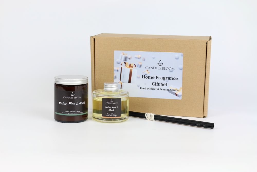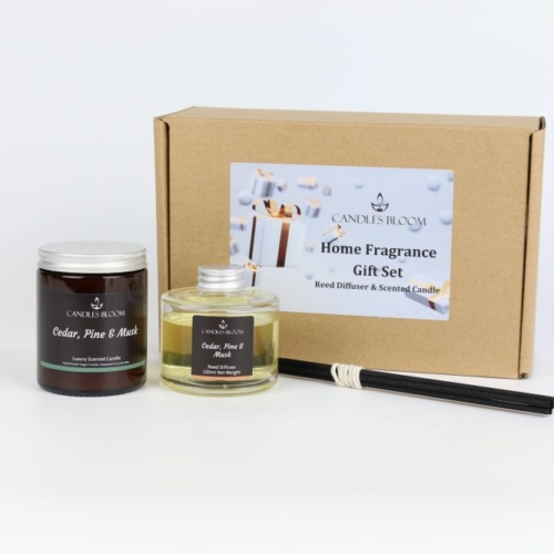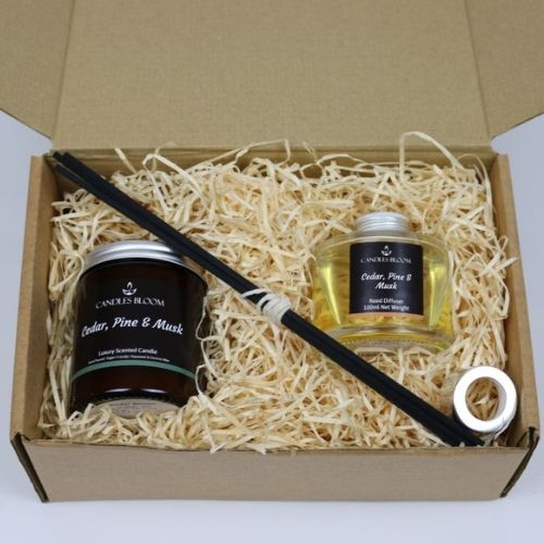 A beautifully curated gift set featuring a Cedar, Pine & Musk scented candle and matching reed diffuser – perfect for creating a calming ambiance in any room. Cedar, Pine and Musk fragrance is intensely rich with warm and cosy aroma, which blends three main scent families: woodsy, green, and musky.