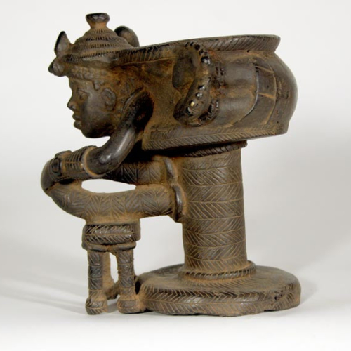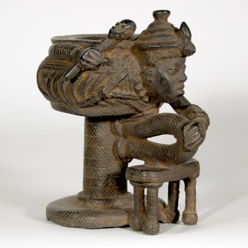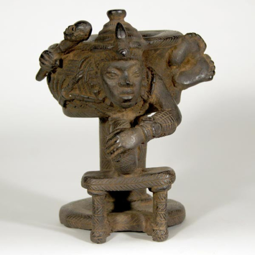 This 7 1/2″ tall object is a fine reproduction of an 11th century Ife piece. There is a male figure “wrapped around a vessel positioned on the circular platform of a stool. The figure holds the looped handle of the stool with its left hand and a scepter in its right.” The original is made of zinc brass and measures 4 7/8″ tall and is the property of the National Commission for Museums and Monuments in Nigeria.