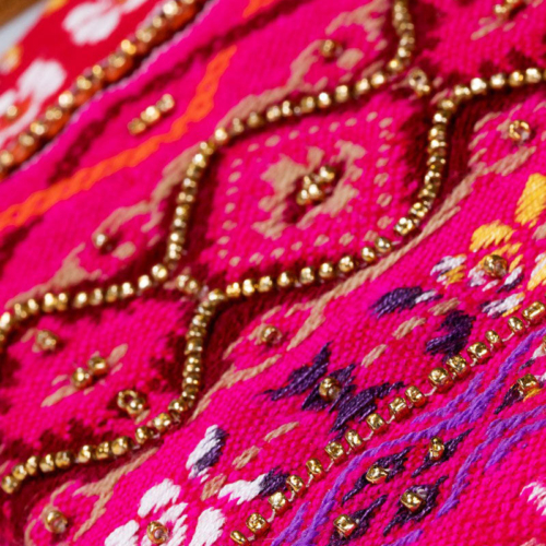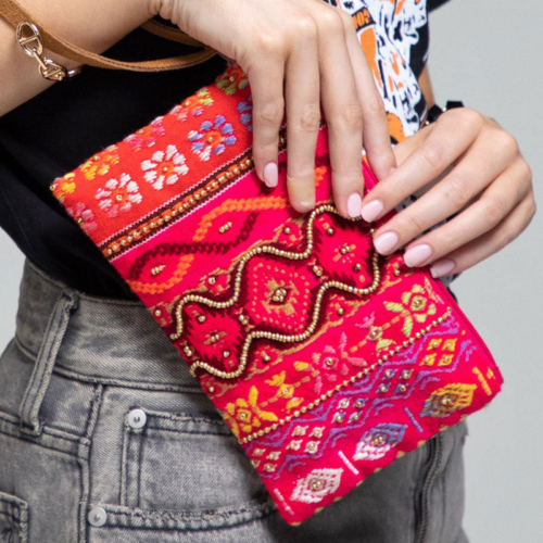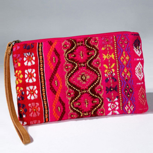 Introducing our exquisite handmade clutch/wristlet, crafted with utmost care and precision in India. Made from the finest cotton yarn, this unique piece features an intricate jacquard ethnic pattern that showcases the artisanal skills of our expert craftsmen. With its beautiful bead accent and sleek leather wristlet, this clutch is perfect for adding a touch of elegance to any outfit. Whether you’re dressing up for a special occasion or simply running errands, this versatile accessory is sure to turn heads and make a statement. Each piece is carefully crafted by hand, ensuring that no two clutches are exactly alike. This makes it not only a beautiful accessory, but also a truly one-of-a-kind piece that you can cherish for years to come. So why wait? Treat yourself or someone special to this beautiful handmade clutch/wristlet today and experience the joy of owning a truly unique and beautiful accessory. product detailsShell: 100% Cotton, Trims: Suede Leather, Lining: 100% PolyesterZipper opening.Imported/Made in India Measurement:Width: 8.5″/ Length: 5″
