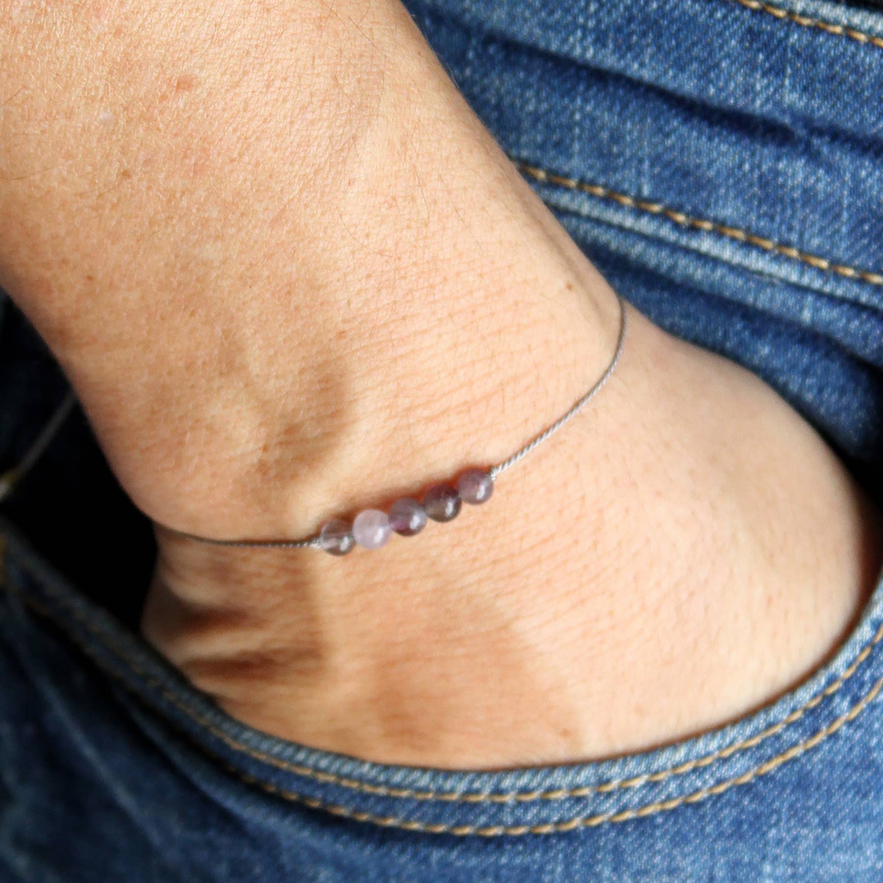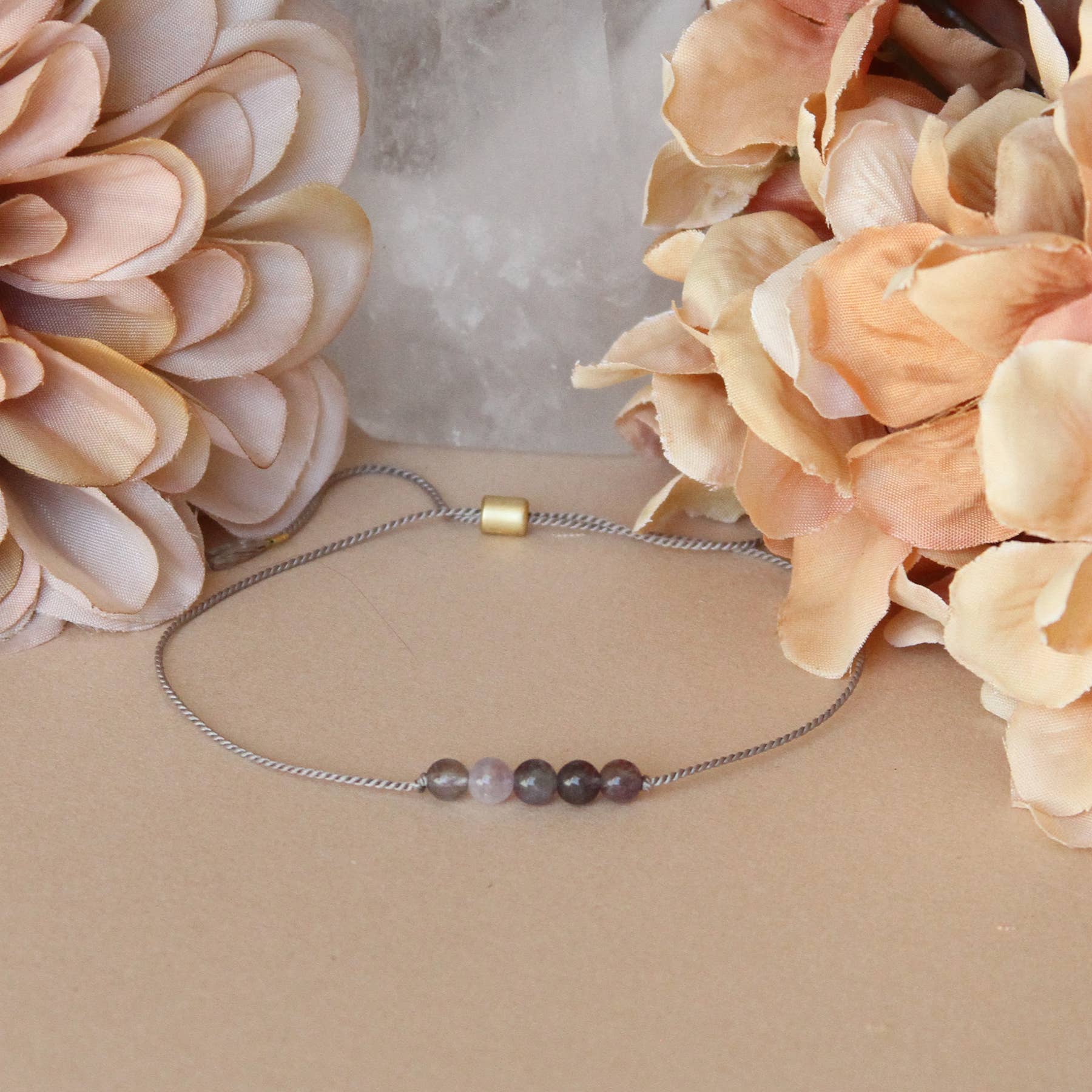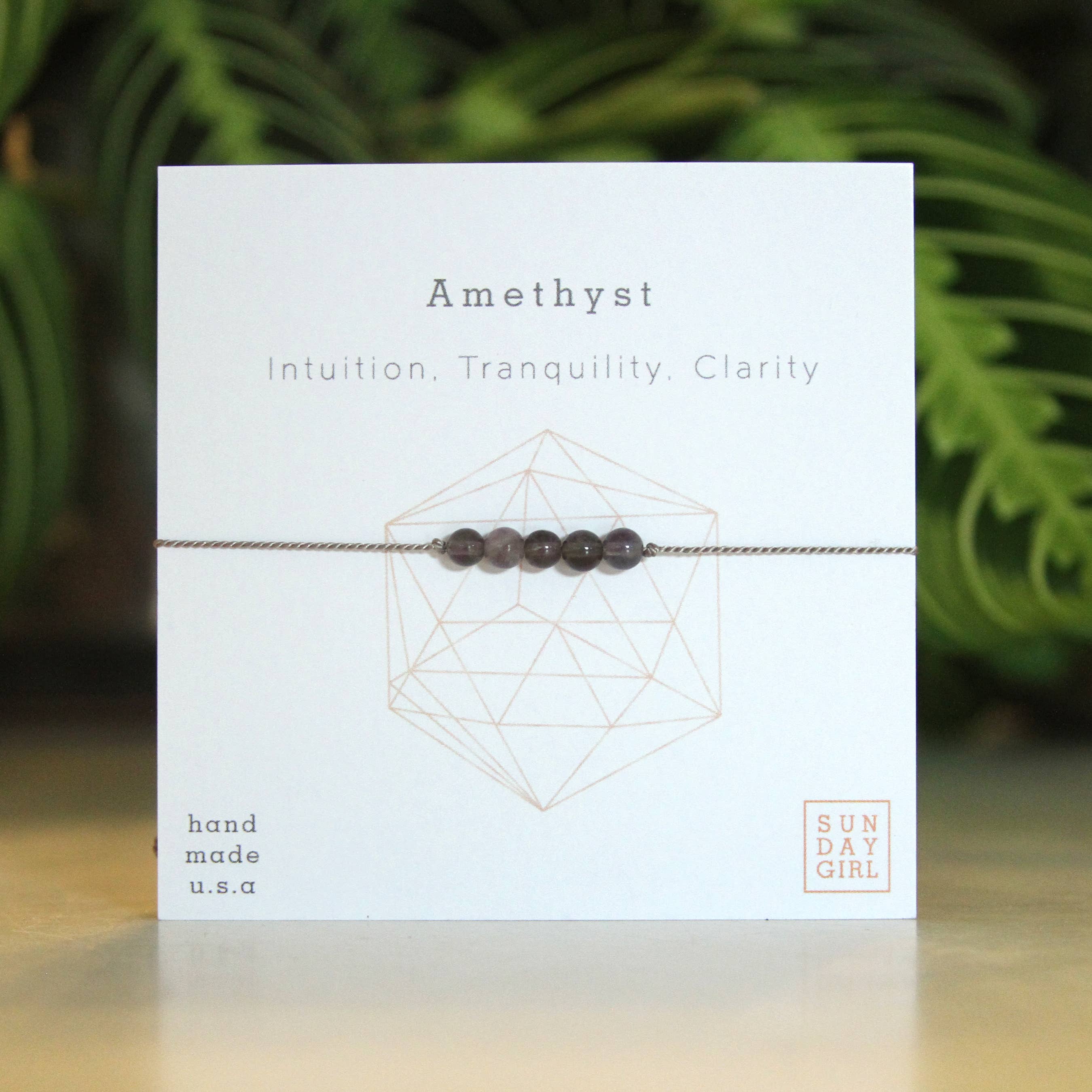 Amethyst bracelet on card with the unique properties of the stone:INTUITION | TRANQUILITY | CLARITYSet an intntion to receive more tranquility in your life, or give a meaningful gift to someone who might need it.Gemstones are strung on silk cord. Bracelet is adjustable with a lovely gold tone sliding bead with anti-fray silicone inside. The look is very dainty, gemstones are approximately 4mm. They are all natural and hand-selected and the size and shape may vary just slightly. Please reach our with any questions.Crystals and gemstones can be beneficial in more ways that just looking pretty. Each of our crystal intention bracelets features genuine gemstones, each with its own benefits. Set an intention and choose the best stone for your needs.*All of our crystals are also infused with reiki energy by a certified reiki practitioner.- Natural amethyst stones (may differ slightly from image)- Grey silk cord- Adjustable size 4″-10″- Original Design Handmade USA