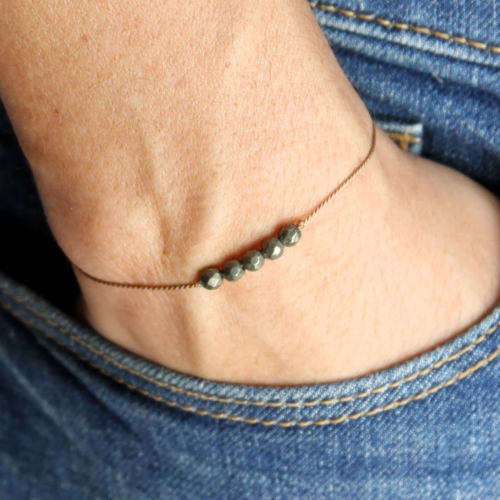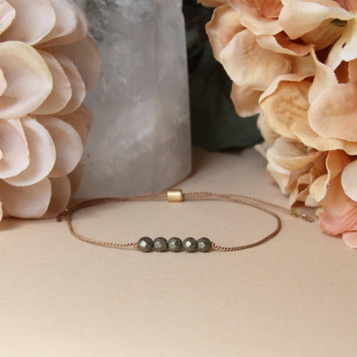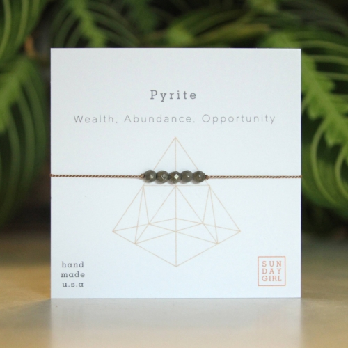 Pyrite necklace on card with the unique properties of the stone:WEALTH | ABUNDANCE | OPPORTUNITYSet an intention to look for new opportunity and accept more abundance in your life , or give a meaningful gift to someone who might need it. Gemstone is strung on silk cord, and adjusts from choker length up to 32″ with a gold tone slider bead. Crystals and gemstones can be beneficial in more ways that just looking pretty. Each of our crystal intention necklaces features a genuine gemstone, each with its own benefits. Set an intention and choose the best stone for your needs. All of our crystals are also infused with reiki energy by a certified reiki practitioner.- Natural pyrite stones (may differ slightly from image)- Beige silk cord- Adjustable size – Handmade in California