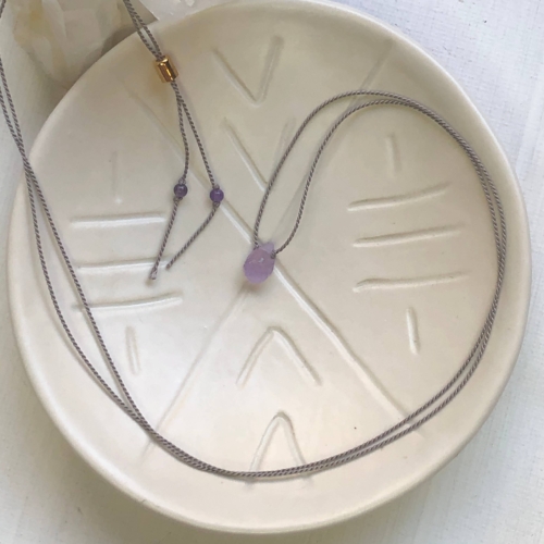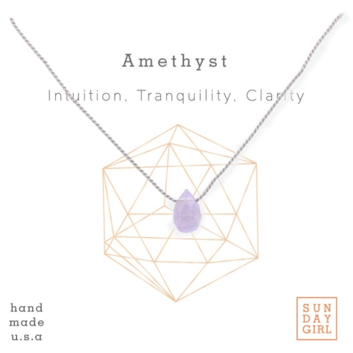 Amethyst necklace on card with the unique properties of the stone:INTUITION | TRANQUILITY | CLARITYGemstone is strung on silk cord, with gold tone slider bead (silicon insert for smooth movement) and packaged on a card with graphic and stone properties.- Natural Amethyst drop (may differ slightly from image)- Grey silk cord- Adjusts from choker up to 30″- Handmade in California