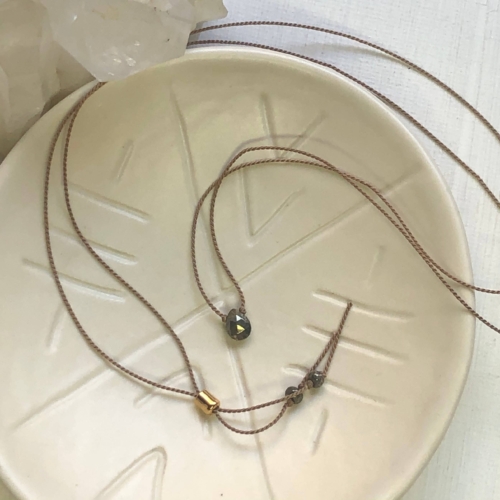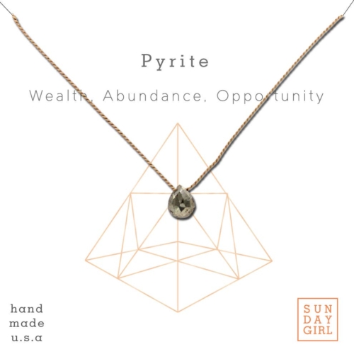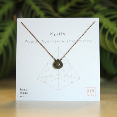 Pyrite necklace on card with the unique properties of the stone:WEALTH | ABUNDANCE | OPPORTUNITYGemstone is strung on silk cord, with gold tone slider bead (silicon insert for smooth movement) and packaged on a card with graphic and stone properties.- Natural Pyrite drop (may differ slightly from image)- Beige silk cord- Adjusts from choker up to 30″- Handmade in California