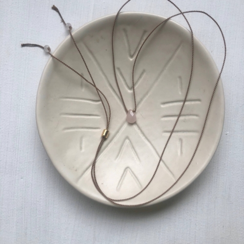 Rose quartz necklace on card with the unique properties of the stone:LOVE | HARMONY | COMPASSIONGemstone is strung on silk cord, with gold tone slider bead (silicon insert for smooth movement) and packaged on a card with graphic and stone properties.- Natural Rose Quartz drop (may differ slightly from image)- Beige silk cord- Adjusts from choker up to 30″- Handmade in California