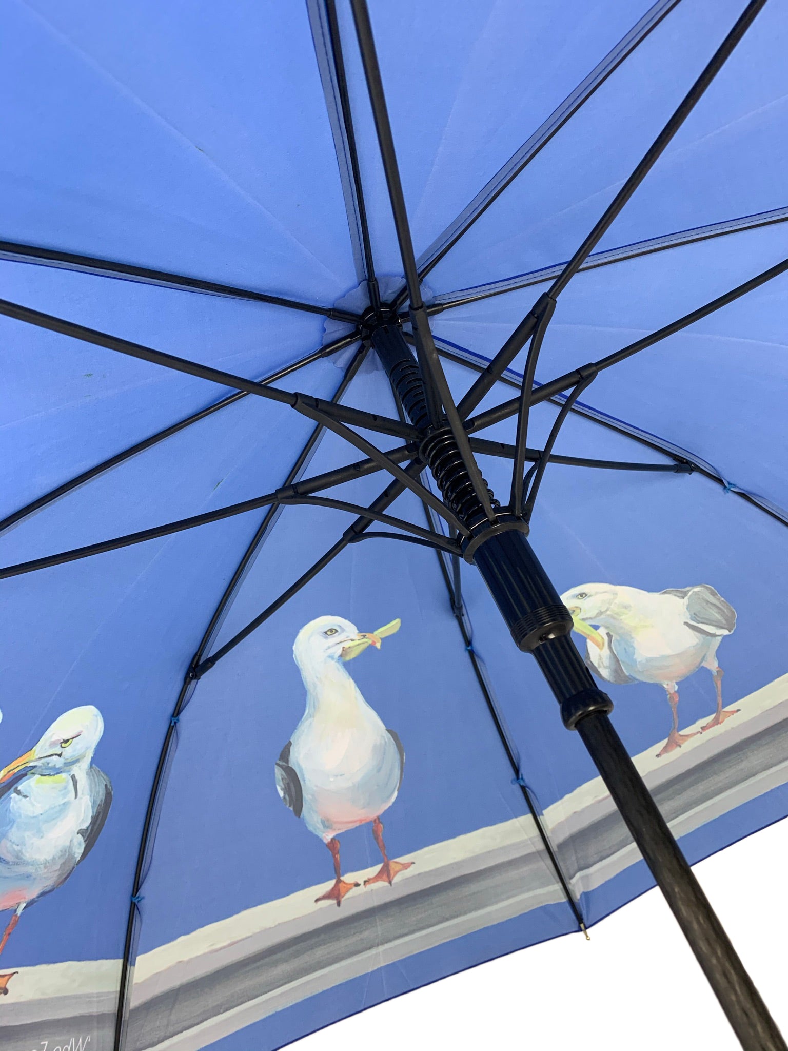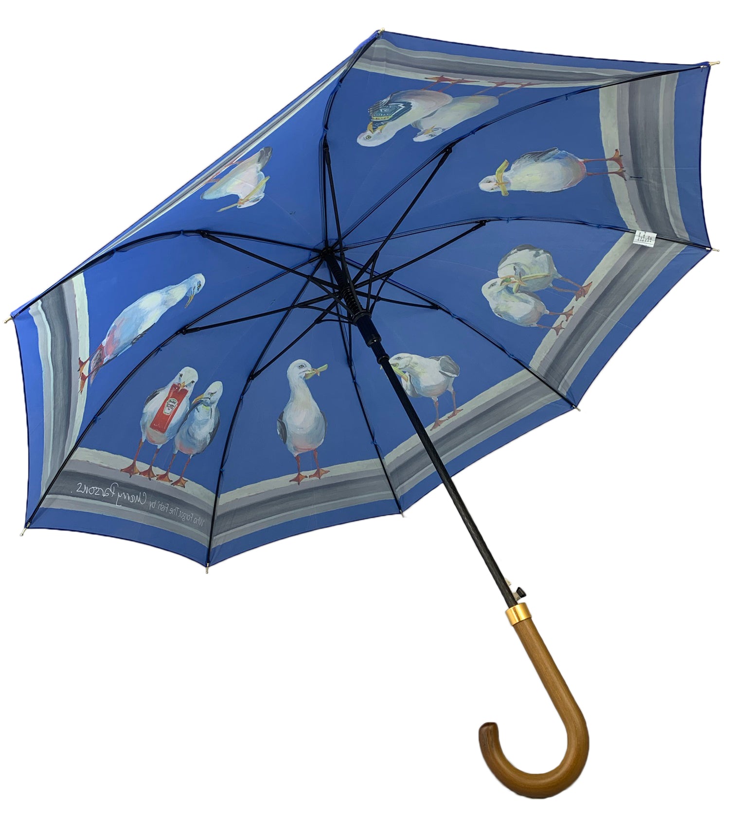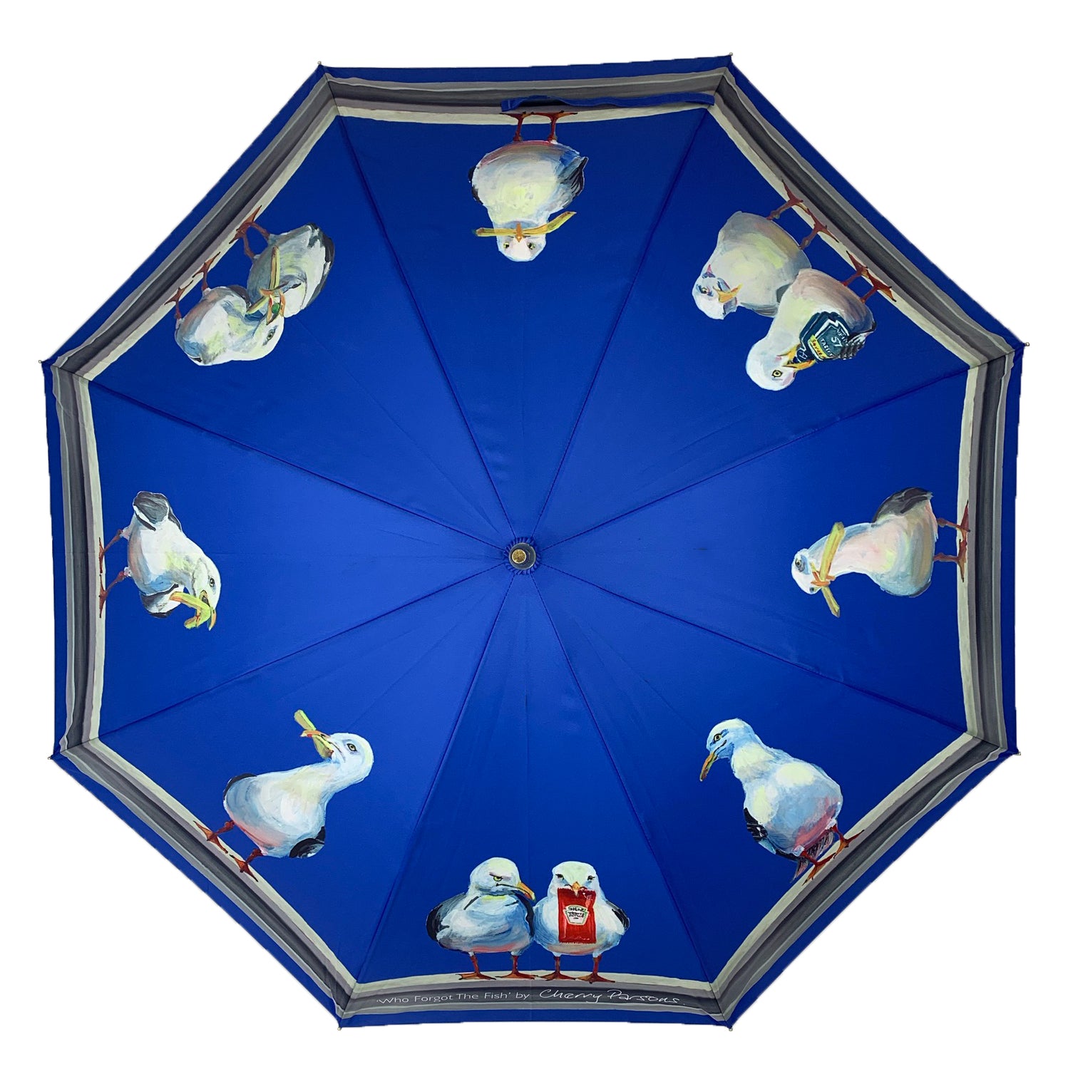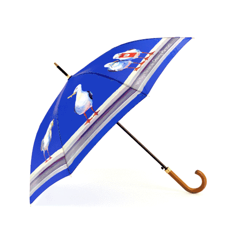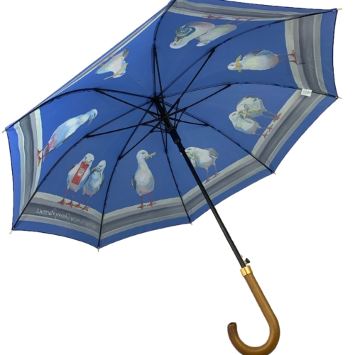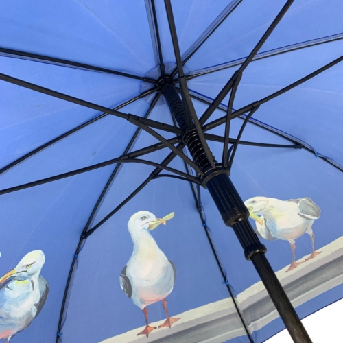 Cherry Parsons Art brings to life the fabulous seagull designs on these printed umbrellas. “Who Forgot the Fish?” I was painting a picture of the Brighton skyline, like a silhouette or Blueprint, on a large canvas. I was only partway through when my daughter said: “I like that mum- stop there!” If you know me, you would know that’s a tough thing for me to do, as I do like to work deeply into my paintings – refining every little detail. I started to paint another canvas on the same theme, but I put a bit more detail into that one. I then painted the third picture in the range. This last one reminded me of something….. The famous photograph from the promotion of the Rockefellers Building in New York in 1932. It is called “Lunch atop a Skyscraper.” By Charles C Ebbets. The picture depicts 11 workers sitting on a beam high over New York eating their lunch. So… I painted a beam into my final picture. Obviously, you can’t make seagulls sit down cross-legged or read the paper. So I painted 11 seagulls standing on the beam eating their lunch. If you compare the original picture and my painting, you will see that I have tried to get the head alignments and heights in similar positions to the photograph. The seagulls, instead of lunchboxes, have the sachets of Heinz Ketchup, Tartar Sauce and chips, plus one holds a pea. The last three have nothing. The one thing that is missing from this meal is a lump of fish. Hence the name “Who Forgot the Fish?”