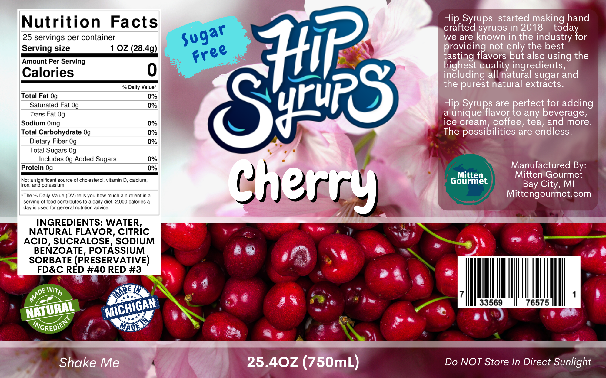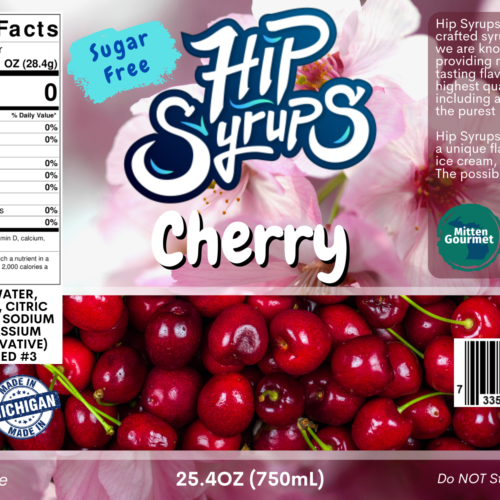 Natural flavoring, that comes in sugar or sugar-free! Ideal for your water, tea, smoothies, shakes, and much more! All products are handcrafted & made right in Michigan! This handcrafted Cherry Hip Syrup taste just like a fresh-picked cherry from a Michigan Cherry Tree