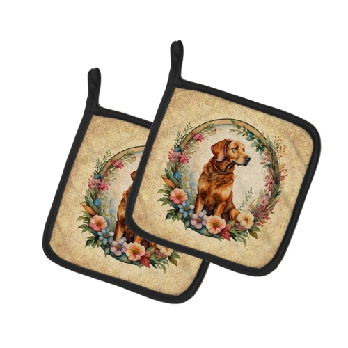 Chesapeake Bay Retriever and Flowers Pair of Pot Holders