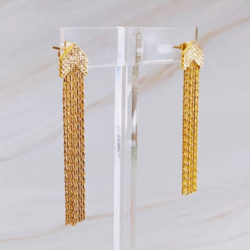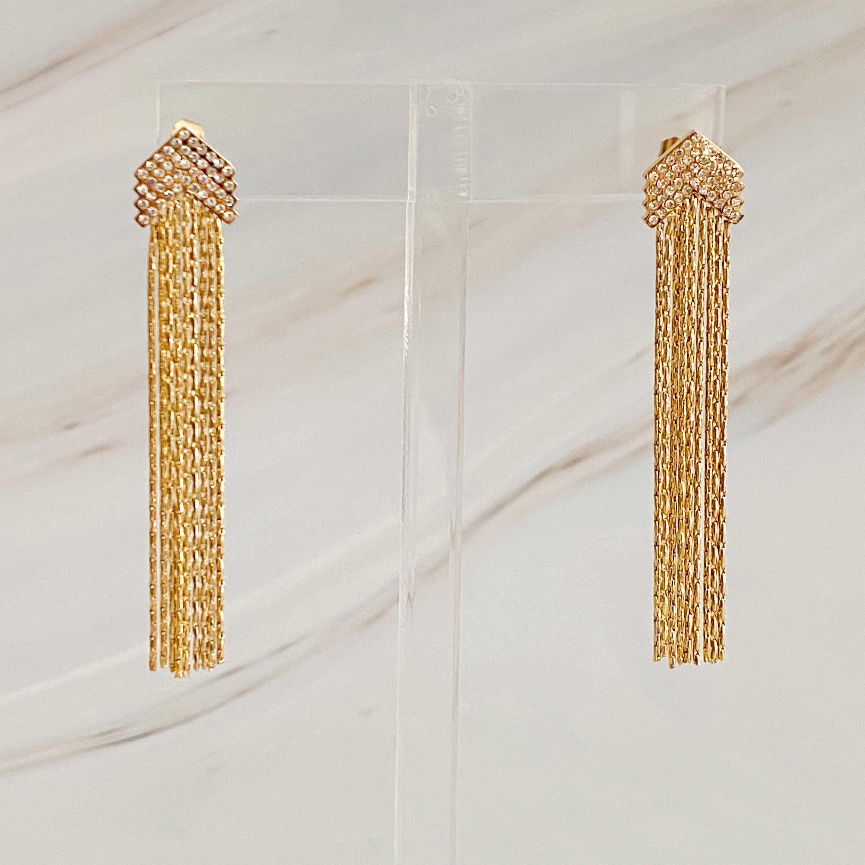 These Chevron Chain Drop Earrings feature a dainty sparkly chevron top with long chain drop details, making them perfect for everyday glam or any special occasions. Crafted with great details, these earrings are sure to impress. Dimensions: approximately 2.3” drop 18k gold plated stainless steel with water and tarnish resistant Lead and nickel free Made in China