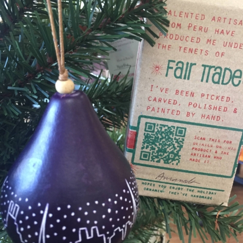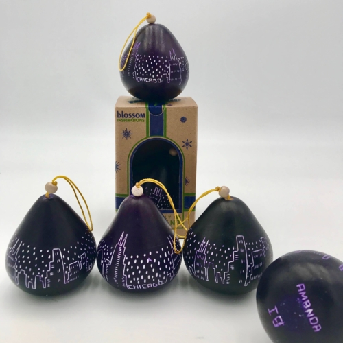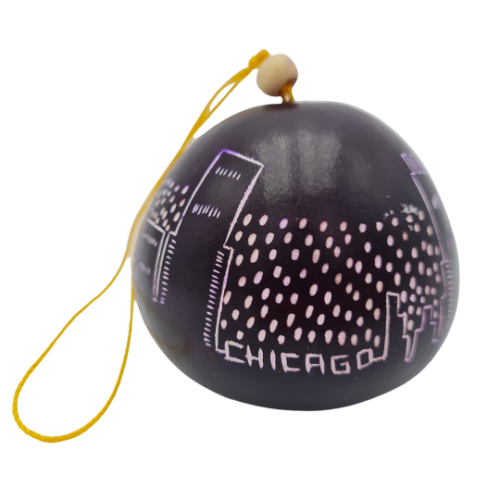 Because we are based in Chicago, we cannot be more thankful and proud for it and we have designed our Chicago Skyline in a gourd with Peruvian artisans, promoting the values of this windy city: diversity, inclusiveness, more women in leadership positions.This holiday season make your ecofriendly choice and demonstrate the values that you stand for.We designed the Chicago skyline in wintertime, showing the snowflakes and in purple to represent the night. Each gourd has been picked, sun-dried, shaped, hand carved and painted. Its carbon footprint: 500 grs, equivalent to 2.5 miles driving your card. The gourd is signed in the back by the artisan, who made it: Amanda