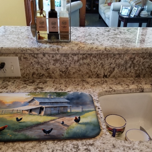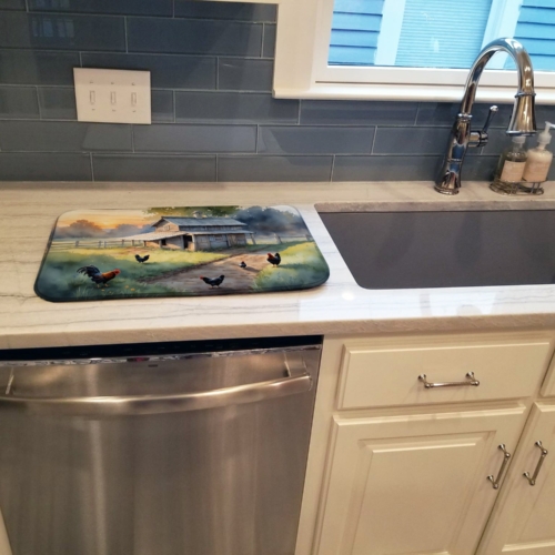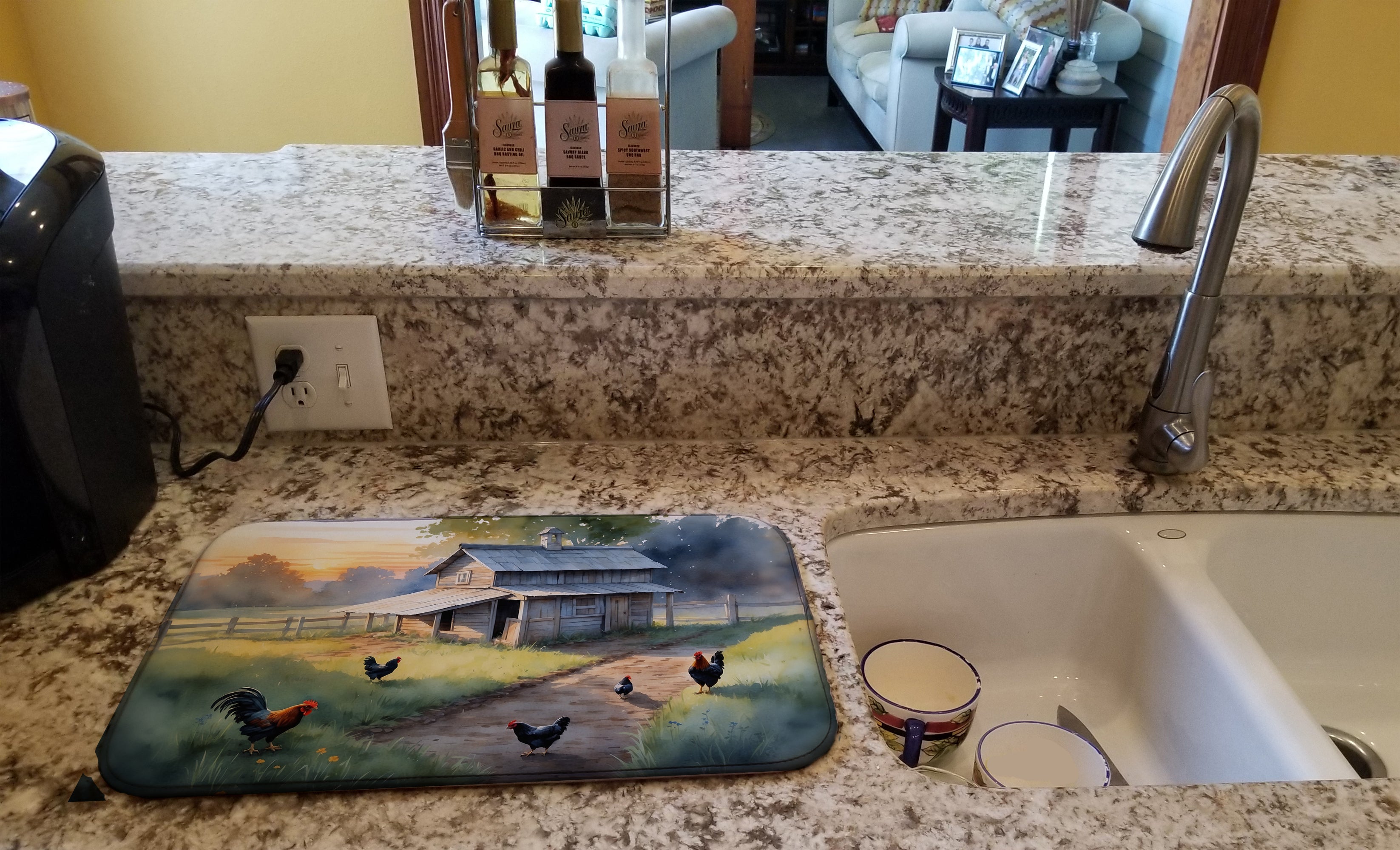 Dish Drying Mat featuring breed specific Chicken artwork. Say goodbye to messy countertops and soggy dish towels with our innovative dish drying mat. Our high-quality dish drying pad is designed to keep your countertops dry while offering a stylish and efficient solution. Whether you’re air drying dishes, glasses, stemware, silverware, pots, pans, bottles, or even fruits and vegetables, our dish mat is the perfect choice. The 14 inches x 22 inches size fits most counters and dish drying racks, and the non-slip design ensures stability. Made with water-absorbent polyester and a polyurethane foam insert, our dish drying mat is not only functional but also durable. It’s machine washable and printed in the USA for long-lasting use. The beautiful artwork adds flair to your kitchen decor, making it a perfect housewarming gift or present for any occasion. Upgrade your kitchen experience with our absorbent and versatile dish drying mat.