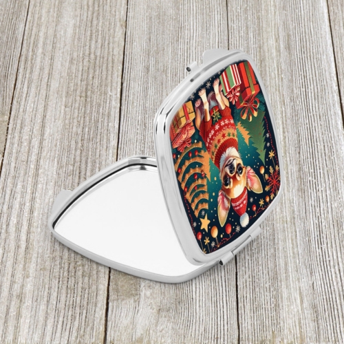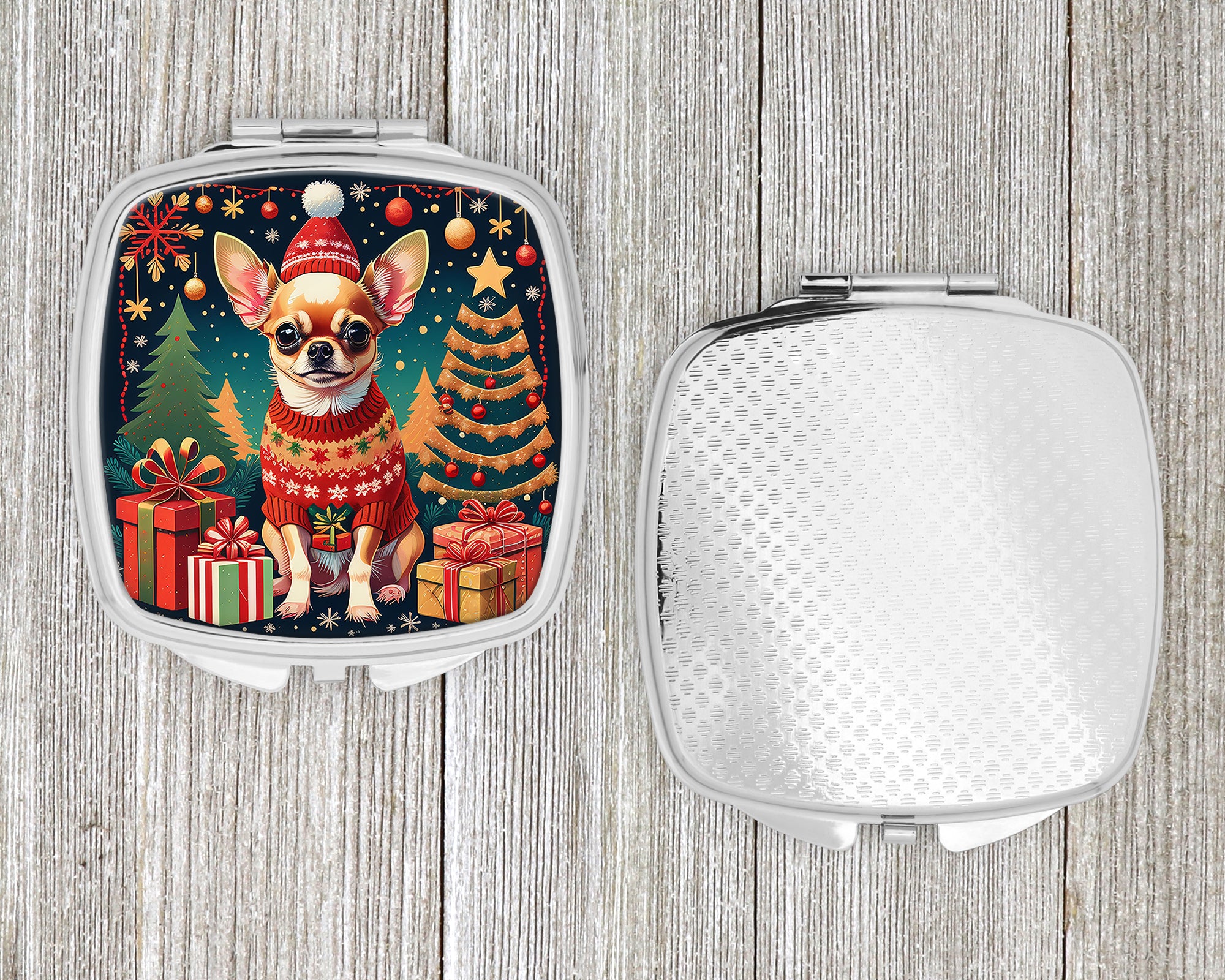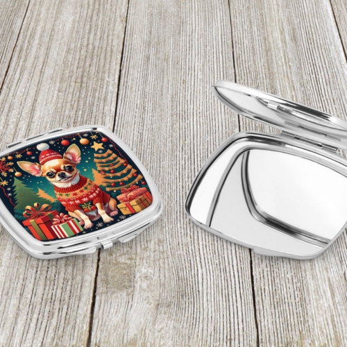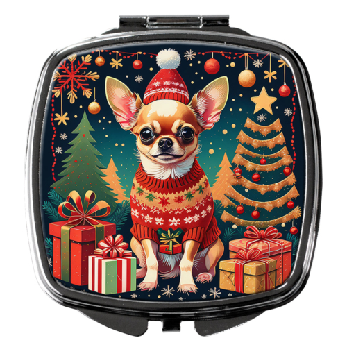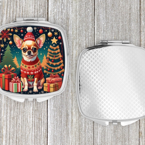 Compact Mirror featuring breed specific Chihuahua artwork. Celebrate Christmas with this Christmas Compact Mirror. Introducing our Square Compact Mirror, a blend of elegance, functionality, and compactness, perfect for on-the-go touch-ups. This Silvertone metal mirror, with dimensions of 2.75 inches x 3 inches x .3 inches, fits effortlessly into your purse, handbag, or pocket, ensuring that you can check your appearance anytime, anywhere. Our compact mirror stands out with its eye-catching artwork on the front, adding a dash of style to this practical accessory. It is more than just a mirror; it’s a statement piece that reflects your personality and aesthetic. When opened, this compact reveals two mirrors inside, doubling your perspective for precise touch-ups. The Silvertone metal construction ensures durability while maintaining a lightweight feel, making it an ideal everyday carry item. Whether you’re rushing to a meeting, prepping for a dinner date, or just need a quick check on your look, our Square Compact Mirror is your reliable companion. Experience the perfect blend of style and practicality with this must-have accessory.