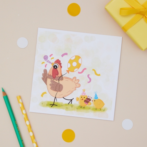 This adorable card features a lively design of a party chicken surrounded by its fluffy chicks, bringing a cheerful and playful touch to any occasion.