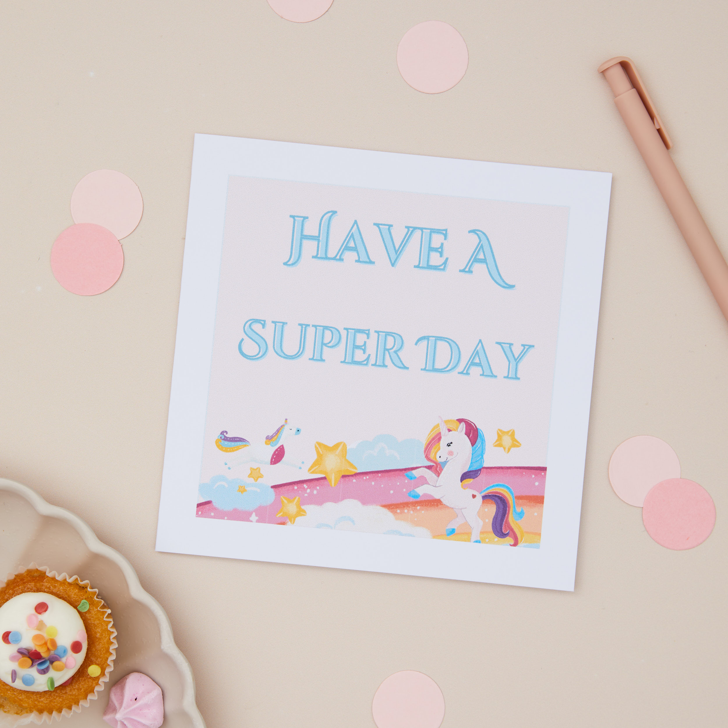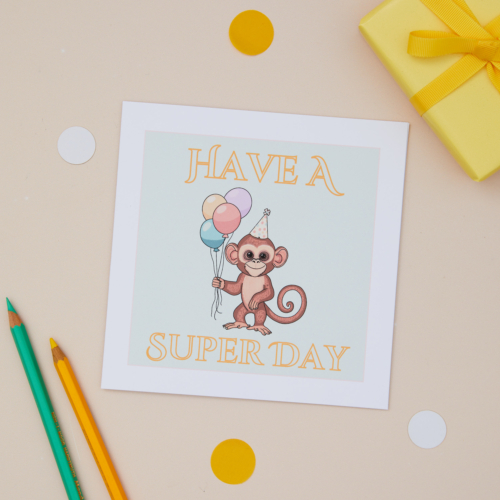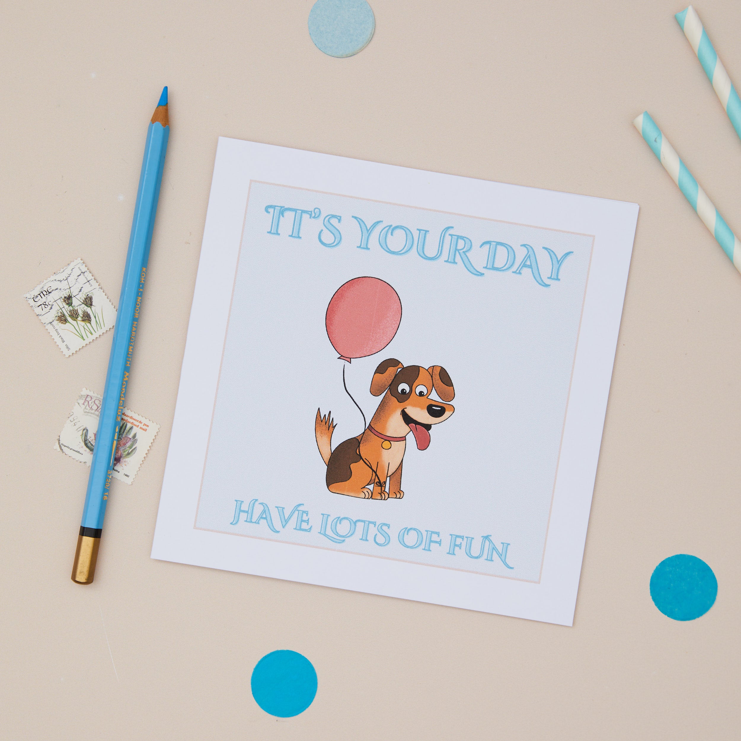 Featuring a cute dog holding a balloon and the uplifting message “It’s Your Day, Have Lots of Fun,” this vibrant card is perfect for celebrating special moments.