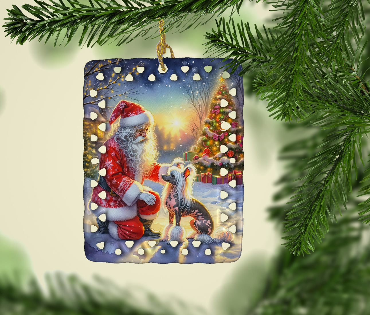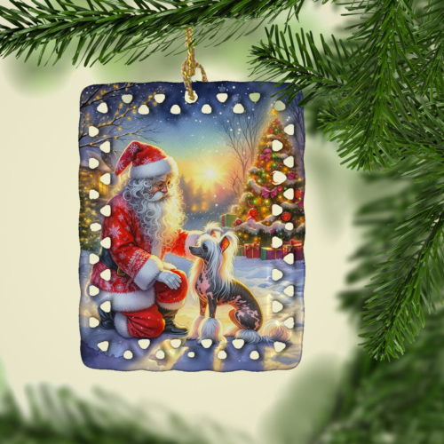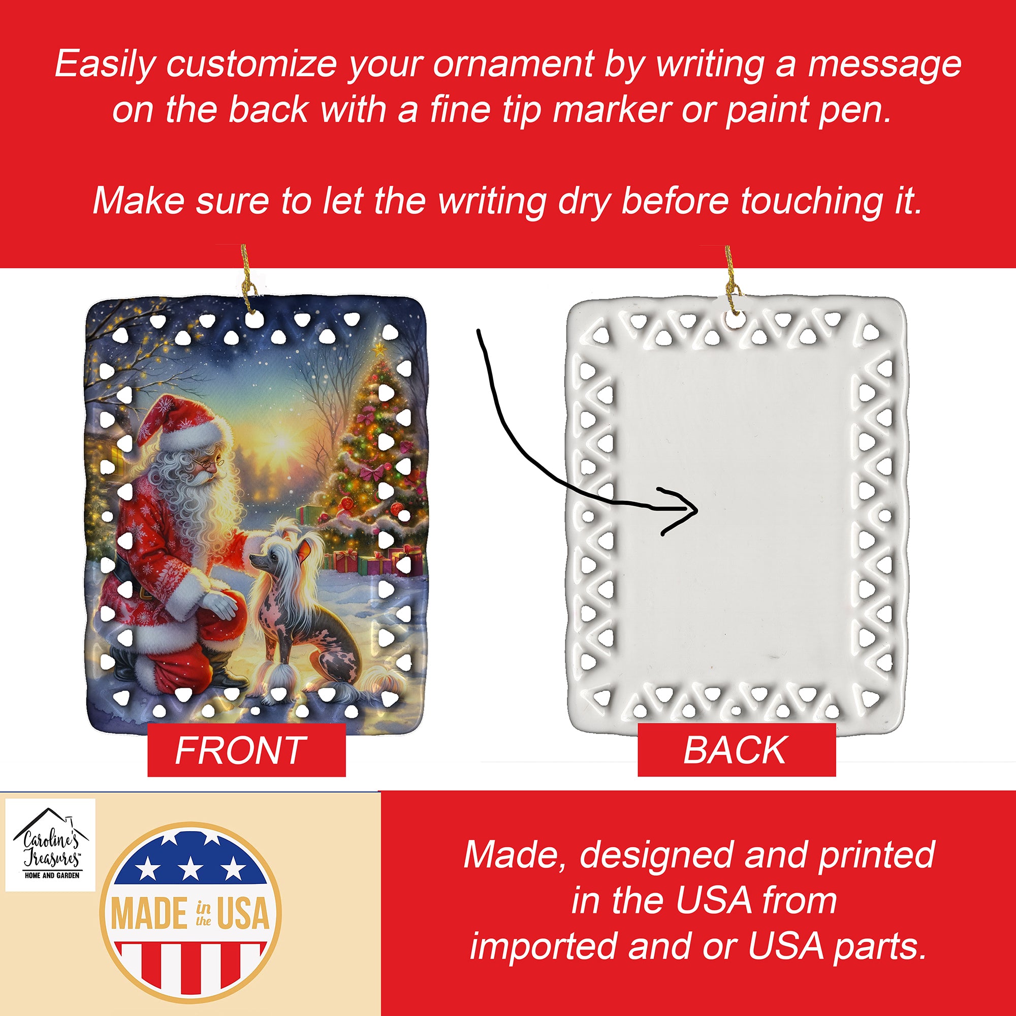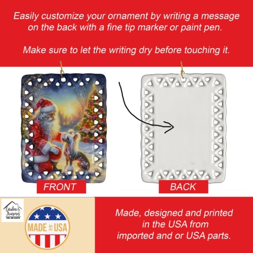 Porcelain Ornament featuring breed specific Chinese Crested artwork. Celebrate Christmas with this Christmas Ornament. Add a unique, personal touch to your holiday decor with our Rectangular Lattice Porcelain Ornament. Perfect for creating cherished memories, this high-quality ornament shines under festive lights, reflecting warmth and joy throughout your Christmas tree. Crafted with a glossy finish, it showcases vibrant, full-color artwork contributed by our talented artists, ensuring your tree is adorned with a burst of color and holiday spirit. What sets this Porcelain Ornament apart is its customizable white back. Use a paint pen or permanent marker to write a heartfelt message, commemorate a special year, or mark an unforgettable date, turning this ornament into a keepsake that will be treasured for years to come. For best results, allow any personalization to dry thoroughly before handling. Each ornament comes complete with a delicate gold cord, making it easy to hang and display. Proudly made in the USA, this ornament measures 3.375 x 2.625 inches and is a thoughtful gift for pet sitters, teachers, family members, or anyone who would appreciate a little extra holiday magic. Bring style, charm, and a touch of personal meaning to your Christmas tree with this beautifully designed ornament..