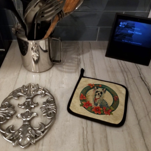 Pair of Pot Holders featuring breed specific Chinese Crested artwork. Celebrate Christmas with this Christmas Pair of Pot Holders. A Pair of Pot Holders to match your kitchen decor. Made in the USA these are thick and functional. Full color artwork decorates the front polyester fabric of the hot pad and accented by a black trim. Use these at as a trivet for your Thanksgiving or Christmas tablescape. Filled with insulated fabric and quilted for durability. These colorful pot holders will make a great gift for your favorite home cook or executive chef. Each pot holder measures approximately 7 1/2 inches by 7 1/2 inches. A hanging tab is included.