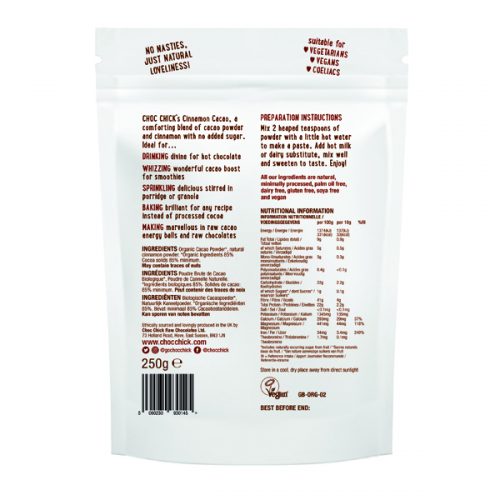 This is a comforting blend of organic raw cacao powder blissfully blended with natural cinnamon for a heart-warmingly rich cocoa drink.