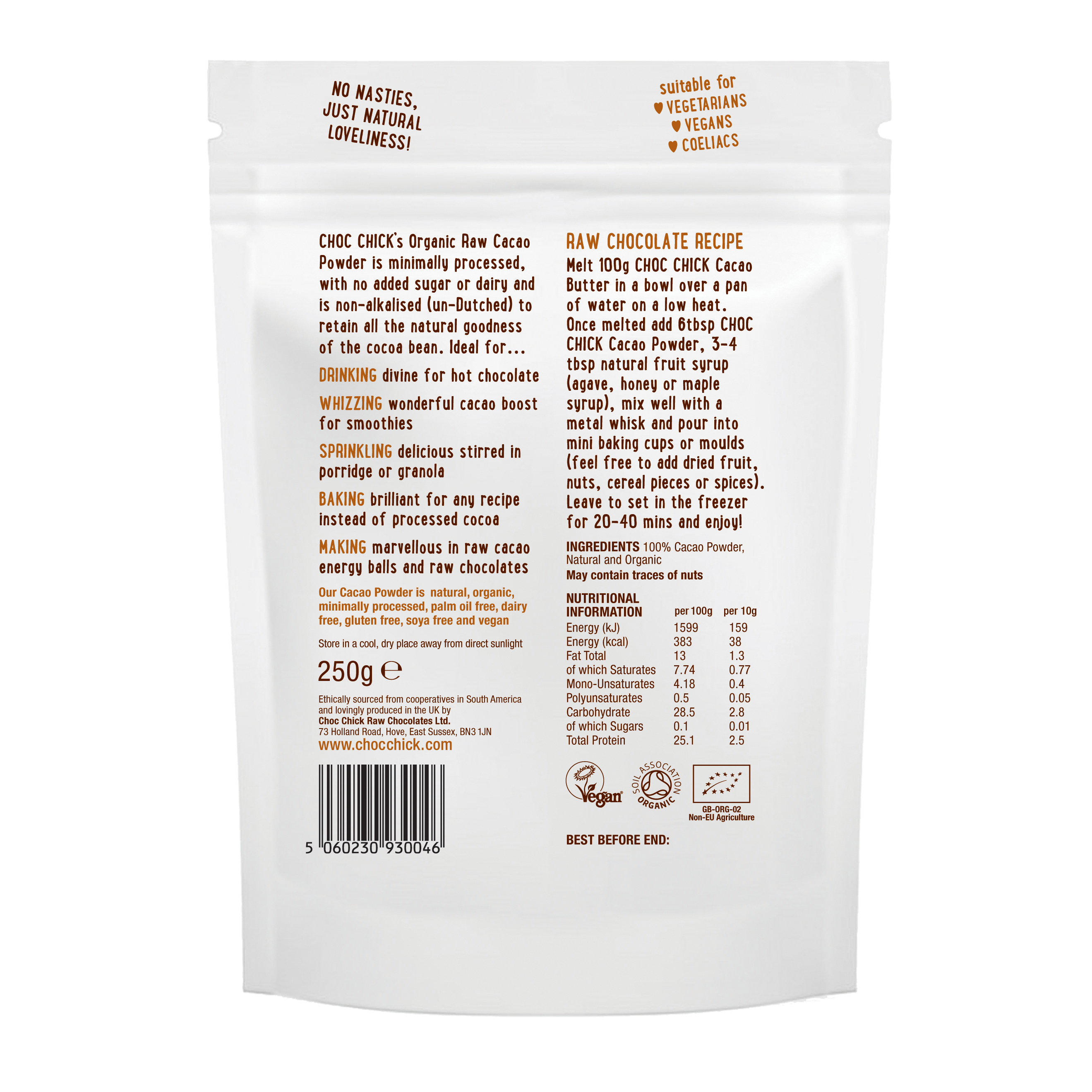 Choc Chick’s Organic Raw Cacao Powder is minimally processed, with no added sugar or dairy and is non-alkalised (un-Dutched) to retain all the natural goodness of the cocoa bean