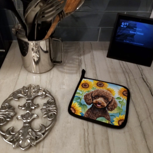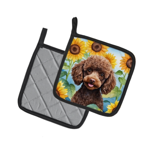 Chocolate Poodle in Sunflowers Pair of Pot Holders