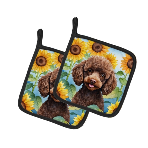 Chocolate Poodle in Sunflowers Pair of Pot Holders