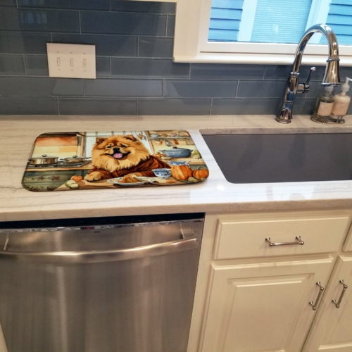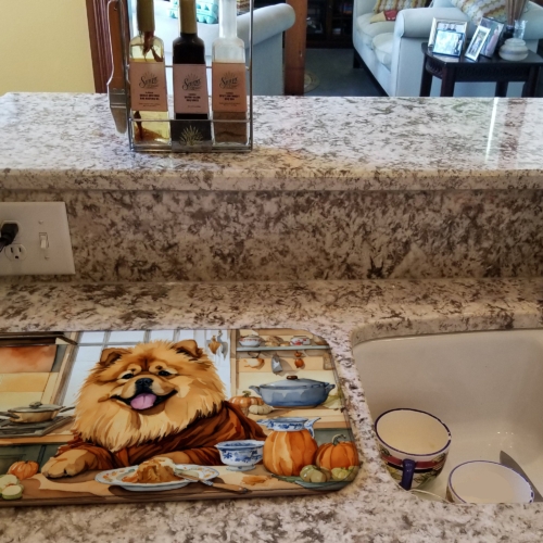 Dish Drying Mat featuring breed specific Chow Chow artwork. Celebrate Halloween with this Halloween Dish Drying Mat. Say goodbye to messy countertops and soggy dish towels with our innovative dish drying mat. Our high-quality dish drying pad is designed to keep your countertops dry while offering a stylish and efficient solution. Whether you’re air drying dishes, glasses, stemware, silverware, pots, pans, bottles, or even fruits and vegetables, our dish mat is the perfect choice. The 14 inches x 22 inches size fits most counters and dish drying racks, and the non-slip design ensures stability. Made with water-absorbent polyester and a polyurethane foam insert, our dish drying mat is not only functional but also durable. It’s machine washable and printed in the USA for long-lasting use. The beautiful artwork adds flair to your kitchen decor, making it a perfect housewarming gift or present for any occasion. Upgrade your kitchen experience with our absorbent and versatile dish drying mat.