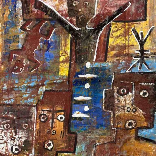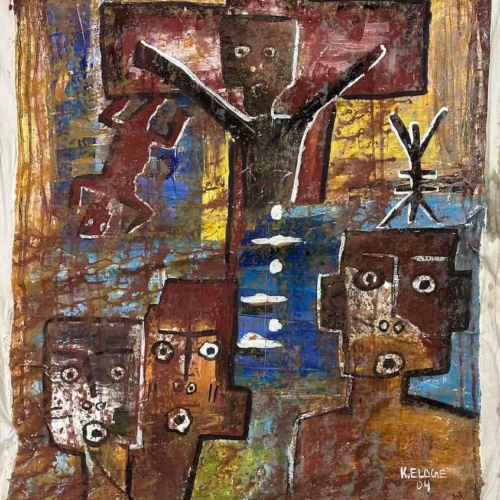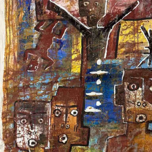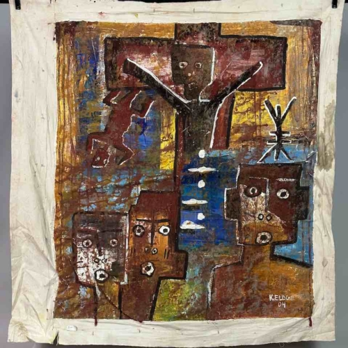 Hand Painted in Togo, Africa, by Kamassa Eloge, a member of a cooperative of artists in Lome, the capital of Togo. He has given this painting the title, “Crucification Devant 3 Temoins”, in French because Togo is a francophone country. It means, “Crucifixion in Front of 3 Witnesses”.The overall dimensions of the canvas are 33 1/2 x 35 1/2″ (85 x 90 cm). The painted area measures 26 3/4 x 30 1/2″ (68 x 77 cm).