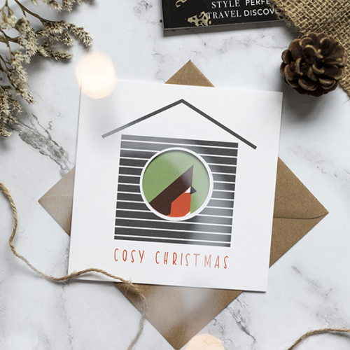Square 15 x 15 cm card with aperture cutout to reveal part of the geometric bird design. The inside has an image but no additional message. 300gsm recycled card stock, Kraft Envelope in cellophane pocket (can be send without cello pocket if requested)