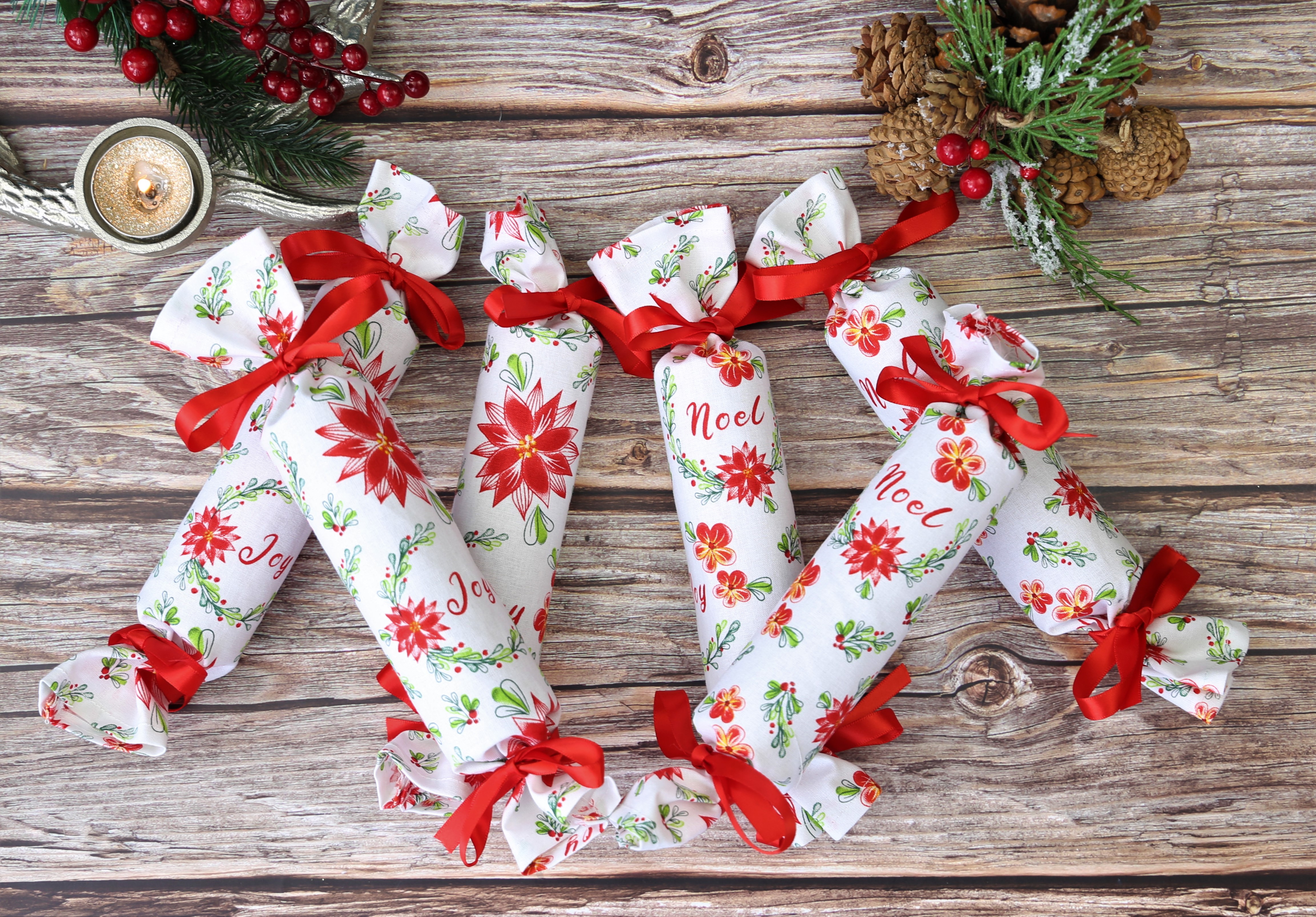 This listing is for a set of 6 reusable Christmas Crackers in a poinsettia design fabric