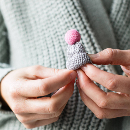 A cute grey knitted bobble hat badge/pin with a pink pom pom. Also available in green and red, and white and red from my range. Appox 2″ in size with a badge fixing on reverse (pictured in photos).