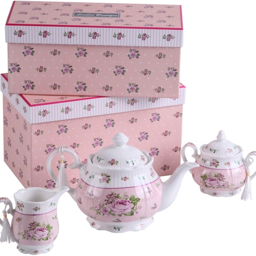 Christmas New Year Family Party Set Special 3 Tier Cake Stand Teapot Milk Jug 4 Cups 4 Saucers (Pink Rose)A very rare opportunity to acquire this party set at a discounted price- 3 Tier Cake Stand (£27.75)- Teapot and Milk Jug Set (£49.75)- 4 Cups/ 4 Saucers (£39.75) Can buy it for £100 today- Saving £17.253 TIER CAKE STAND- Porcelain cake plate stand- Bottom Plate: 26cm wide, Top Plate: 19cm wide, Height: 22cm-High Quality White Porcelain China with Victoria Style Flower-Same flower design of gift box-Silver Colour metal stand, not plasticTEAPOT MILK JUG SET-Teapot sets come as 1 teapot with lid, 1 sugar bowl with lid and 1 Cream Milk Jug-Teapot with build in filter at end of the sprout, suitable for loose tea.-Teapot Sugar Bowl and Cream Milk Jug in white colour with shabby chic vintage design in blue and pink colour. Teapot sugar Bowl -and Milk Jug can be used separatly, in a same design lovely gift box, ideal for gift and present4 CUPS 4 SAUCERS-Cups and Saucers set include 4 cups and 4 saucers, Blue, Teal, Beige and Pink 4 colours mixed in one set. Rose Blue, Rose Pink, ——Butterflies and Bird Rose Butterfly options have 4 teacups and saucers in the same colour.-Cups and saucers set is in Beautiful gift box, Gift box cups ans saucers match design-Capacity of the cup: 220ml, Sizes:Cup Width10 x Depth 7cm, Saucer: Diameter 15cm-Cups and Saucers set is made of good quality of porcelain, decrated with touch of beautiful life-Dishwasher and microwave safe