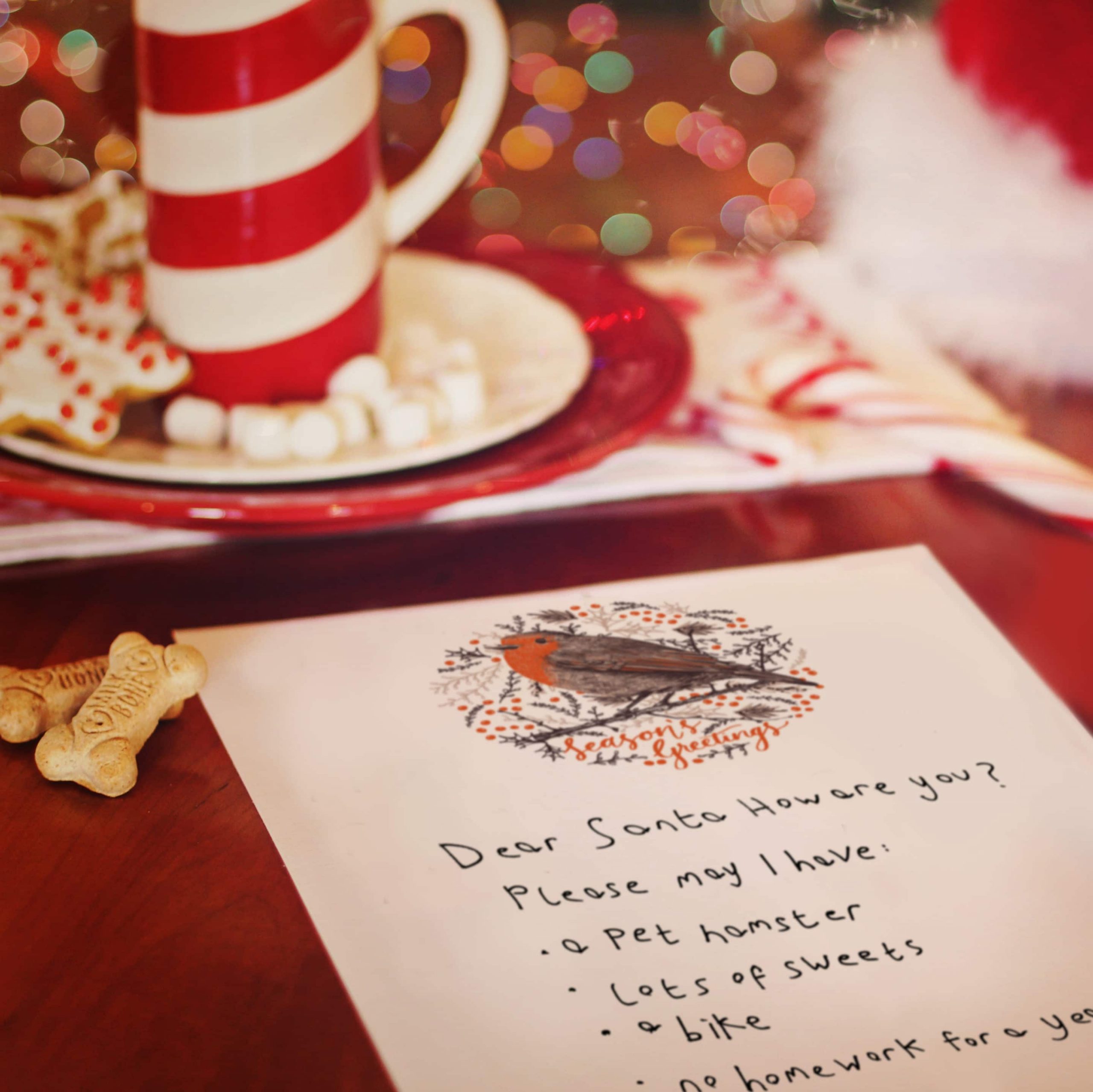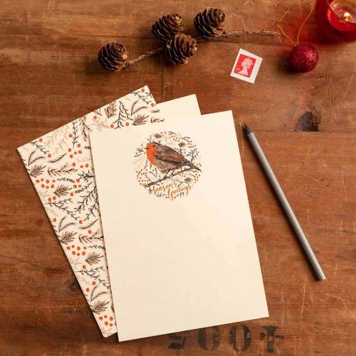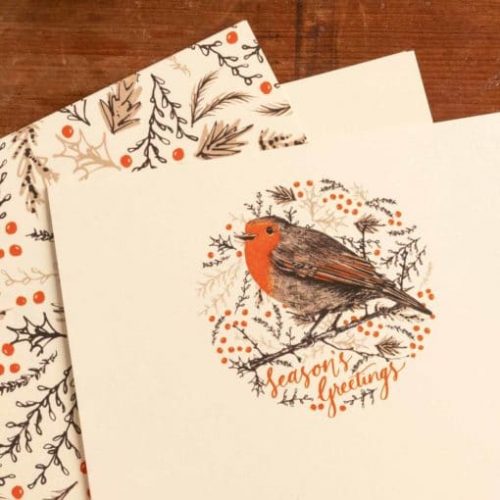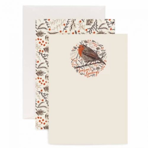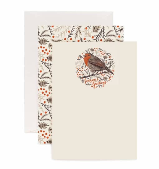 Each sheet has an illustration of the robin and ‘Season’s Greetings’ script text printed on one side and a pattern of winter foliage and holly berries printed on the reverse.
