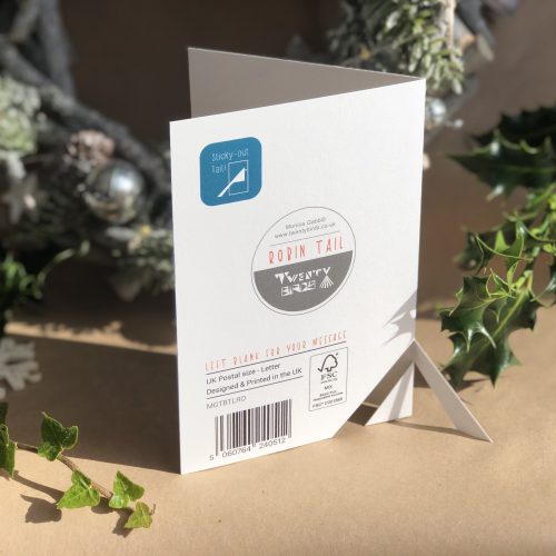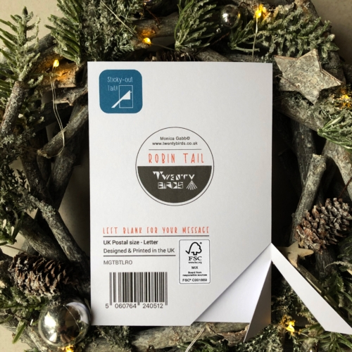 A6 card with Robin geometric bird design. The tail sticks out from the card when it is on display. The inside is blank for your message. Printed onto 300gsm card stock, Kraft Envelope in cellophane pocket to protect the tail.